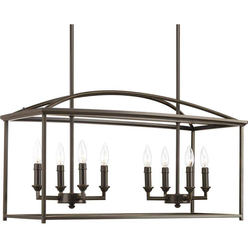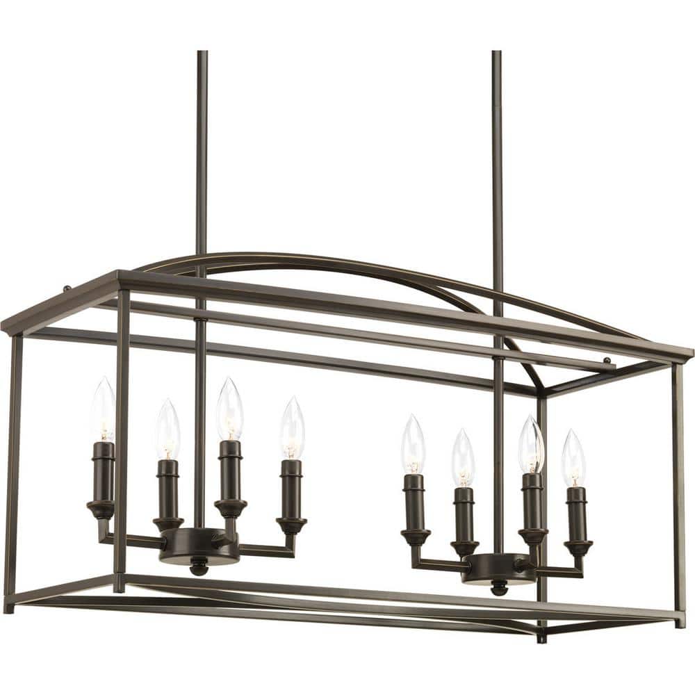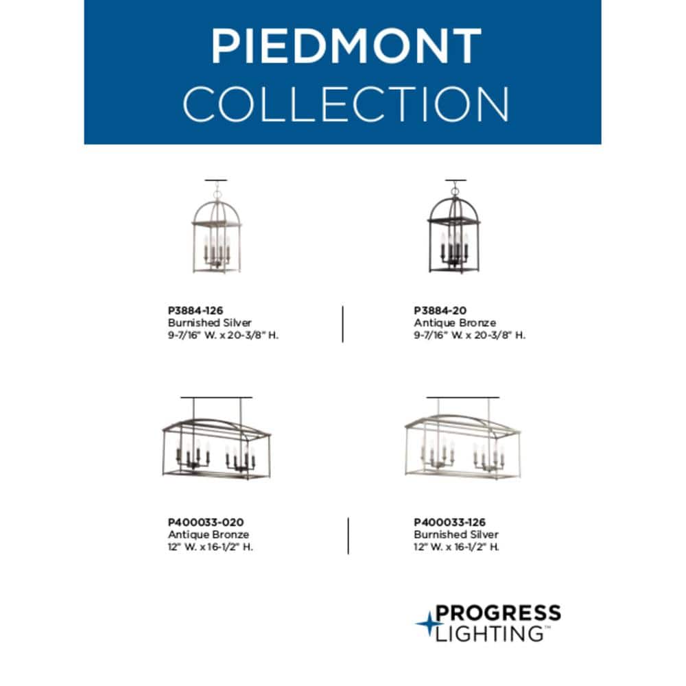 Illuminate your space with the Piedmont Collection 8-Light Chandelier by Progress Lighting. This stunning farmhouse-style light fixture in antique bronze adds an elegant touch to dining rooms or entryways with its soaring arches and candle chaser accents. Ideal for mid-century inspired interiors, it pairs well with other pieces from the Elevate Collection.