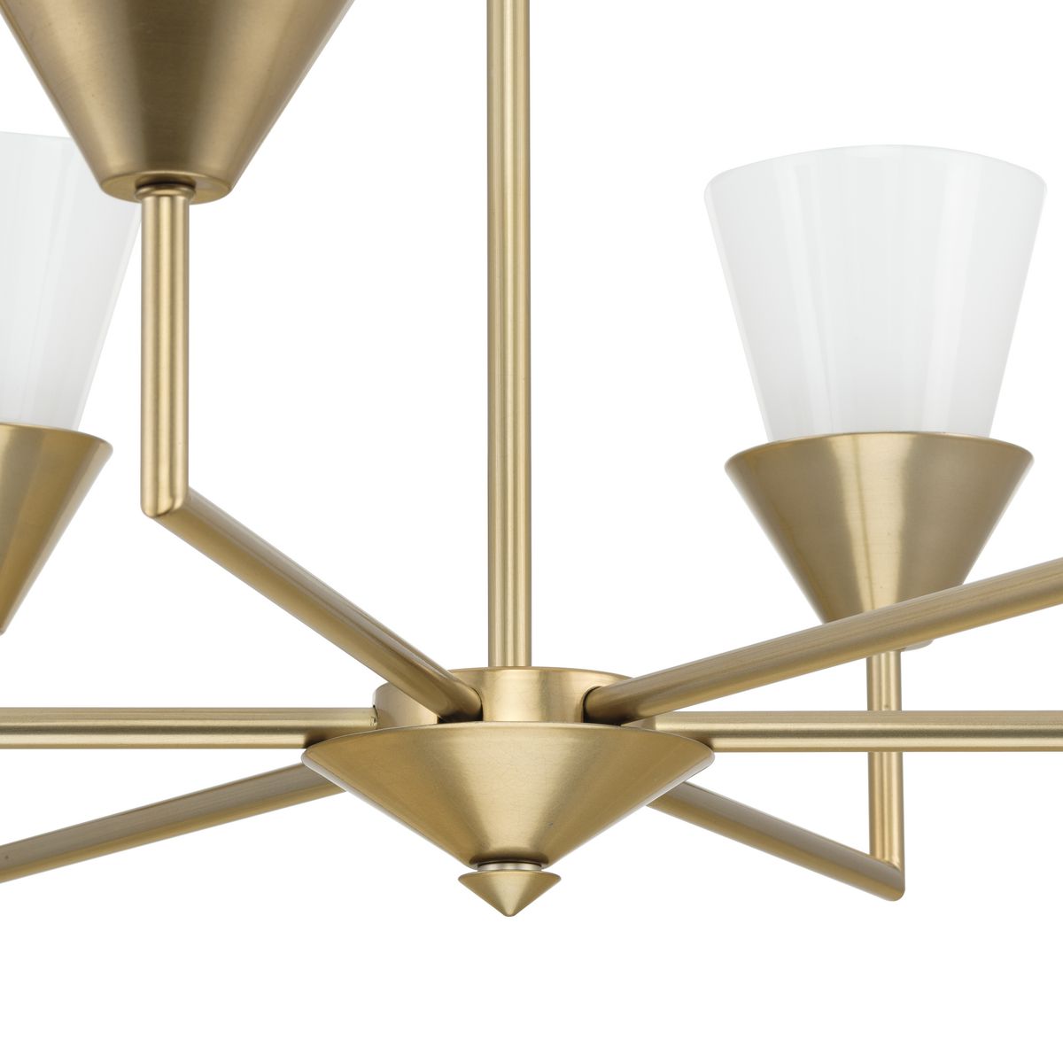 Elevate your space with the Pinellas 6-Light Gold Chandelier, a modern masterpiece from Progress Lighting. This chandelier blends luxe industrial aesthetics with timeless contemporary elegance, featuring a striking conical design in a soft gold finish that elegantly casts light through hand-painted opal glass shades, creating a warm, inviting ambiance.