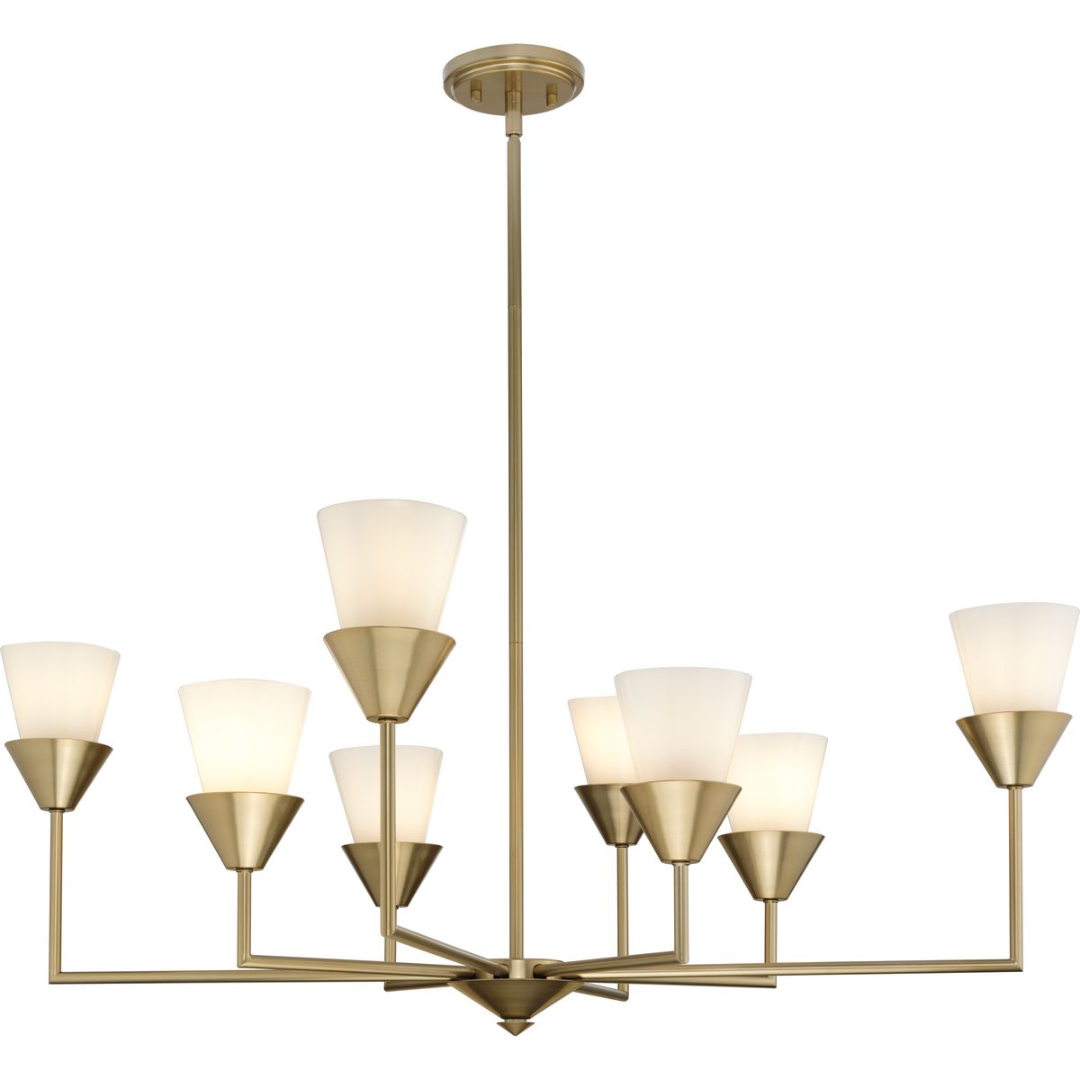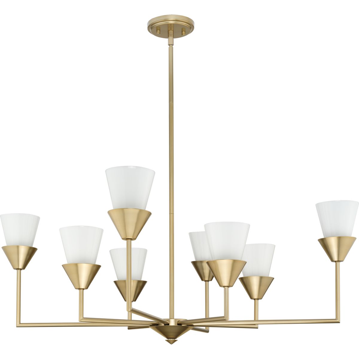 Illuminate your space with the Pinellas 8-Light Gold Chandelier, a striking blend of modern sophistication and timeless design. Crafted by Progress Lighting, this chandelier features a soft gold finish and artfully arranged conical elements that perfectly complement contemporary interiors. Offering ambient illumination through hand-painted opal glass shades, it's an elegant addition to dining rooms, great rooms, and beyond.
