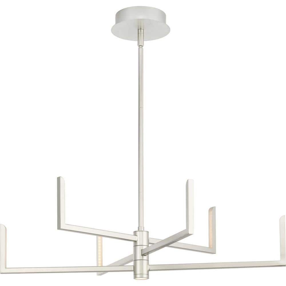 Illuminate your space with the Pivot LED Modern Chandelier by Progress Lighting. This chandelier features a sophisticated burnished nickel finish with sleek frosted glass shades, providing a warm, ambient glow. Perfect for contemporary interiors, this fixture enhances dining rooms, kitchens, or living areas with a touch of modern elegance.