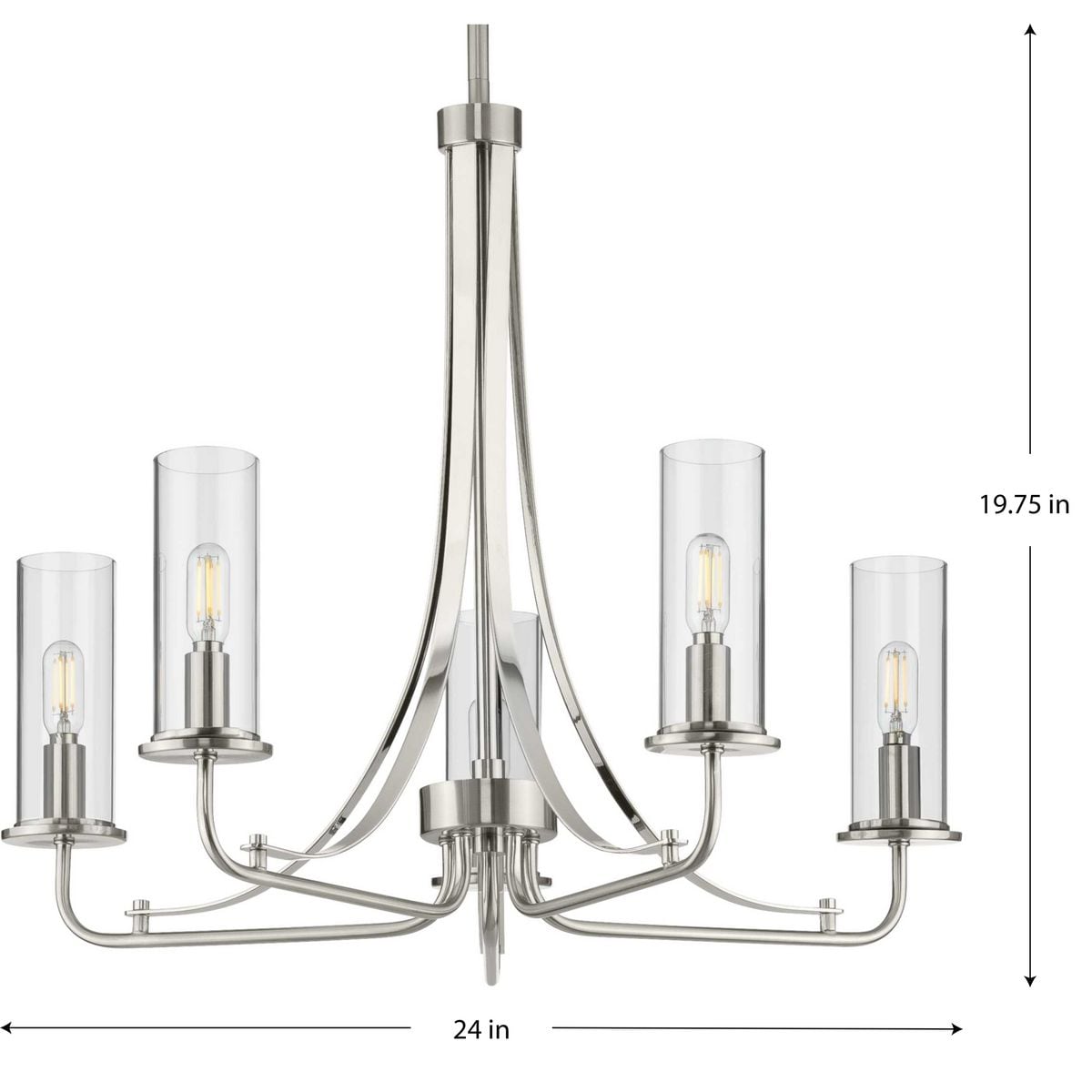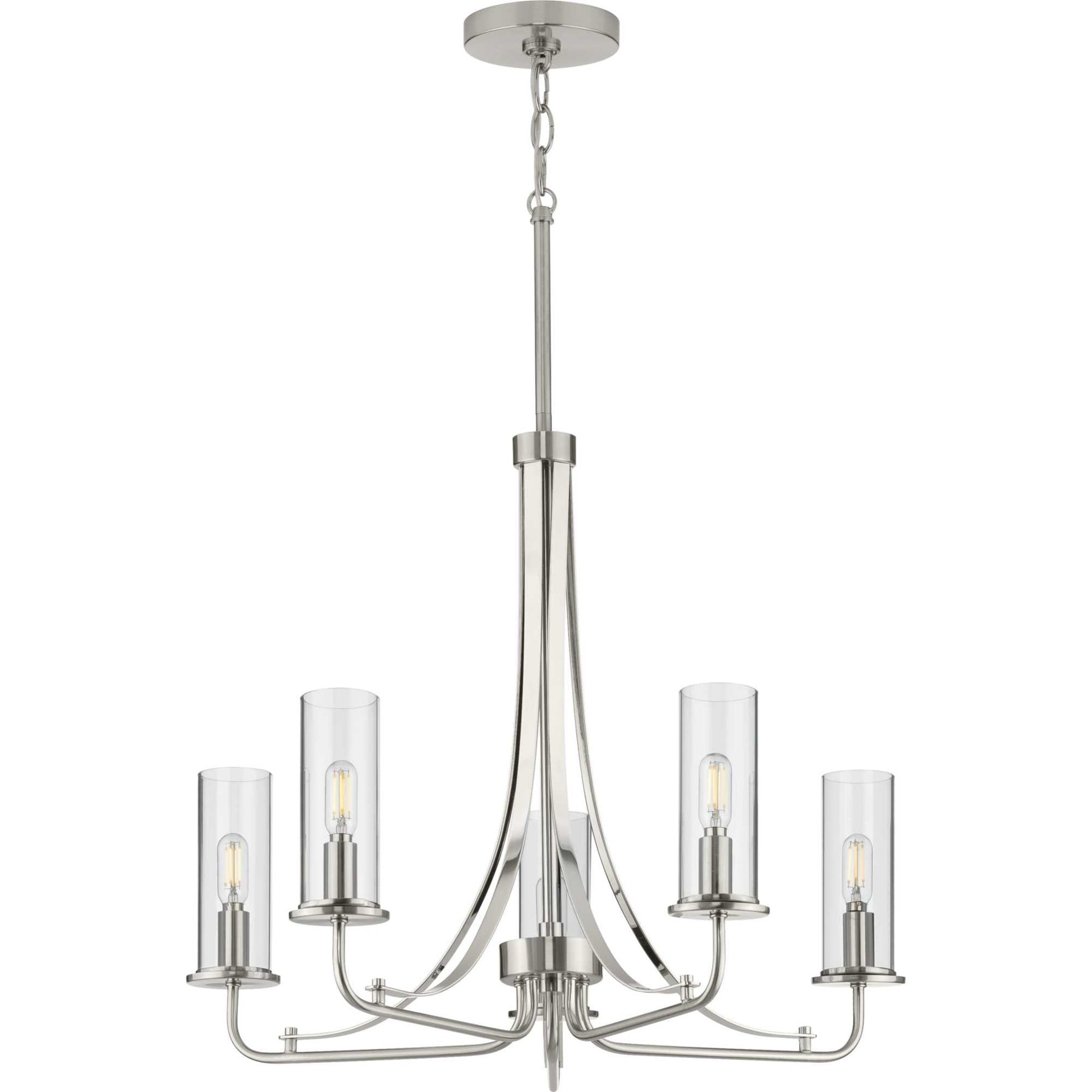 Illuminate your space with the timeless elegance of the Riley 5-Light Brushed Nickel Traditional Chandelier by Progress Lighting. This chandelier combines a sleek brushed nickel finish with clear glass shades, perfect for elevating any room with its refined style. Ideal for dining rooms, kitchens, or foyers, it offers a luxurious ambiance and is versatile for various ceiling heights.