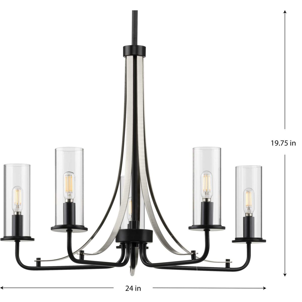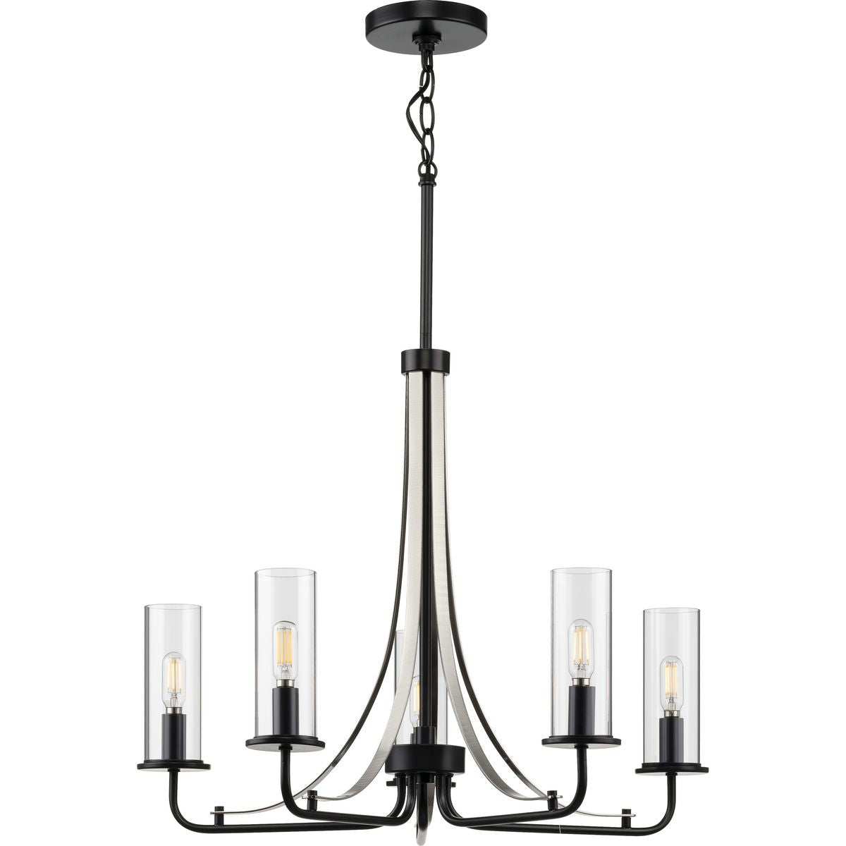 The Riley 5-Light Matte Black Chandelier blends traditional elegance with modern simplicity, making it perfect for versatile room settings. Its clear glass cylindrical shades offer brilliant illumination, suspended from a sleek matte black frame that adds a touch of classic sophistication.