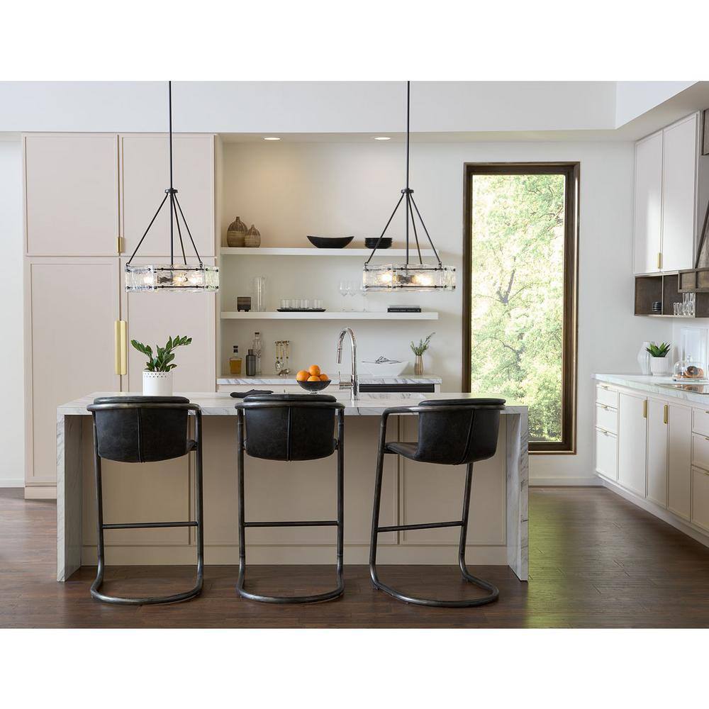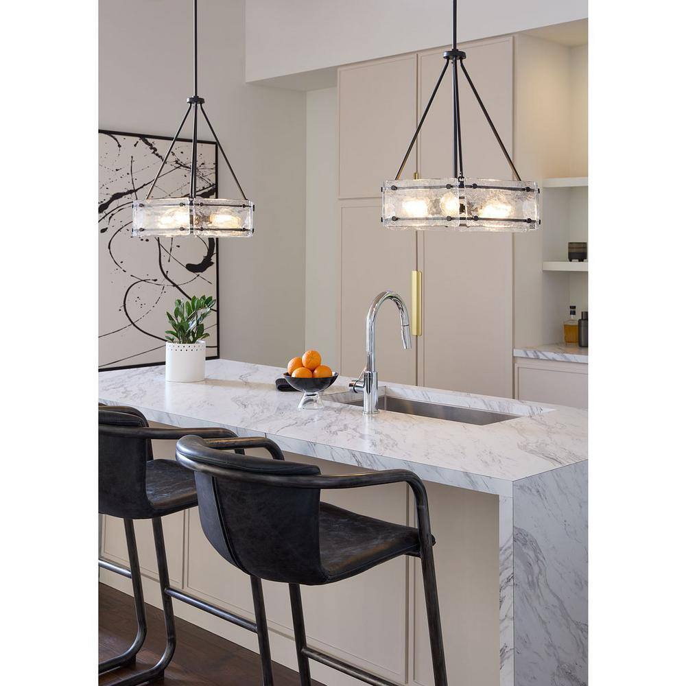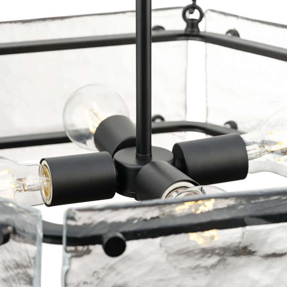 Illuminate your space with the Rivera 4-Light Chandelier, a stunning blend of modern craftsmanship and luxe industrial design. Its rich matte black frame elegantly accentuates handcrafted clear textured glass for a captivating ambient glow, making it a perfect statement piece for contemporary dining rooms, bedrooms, and great rooms.
