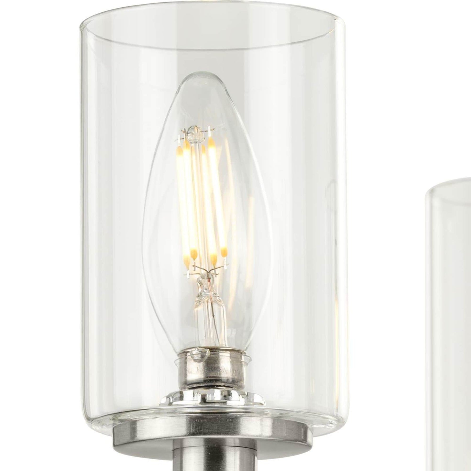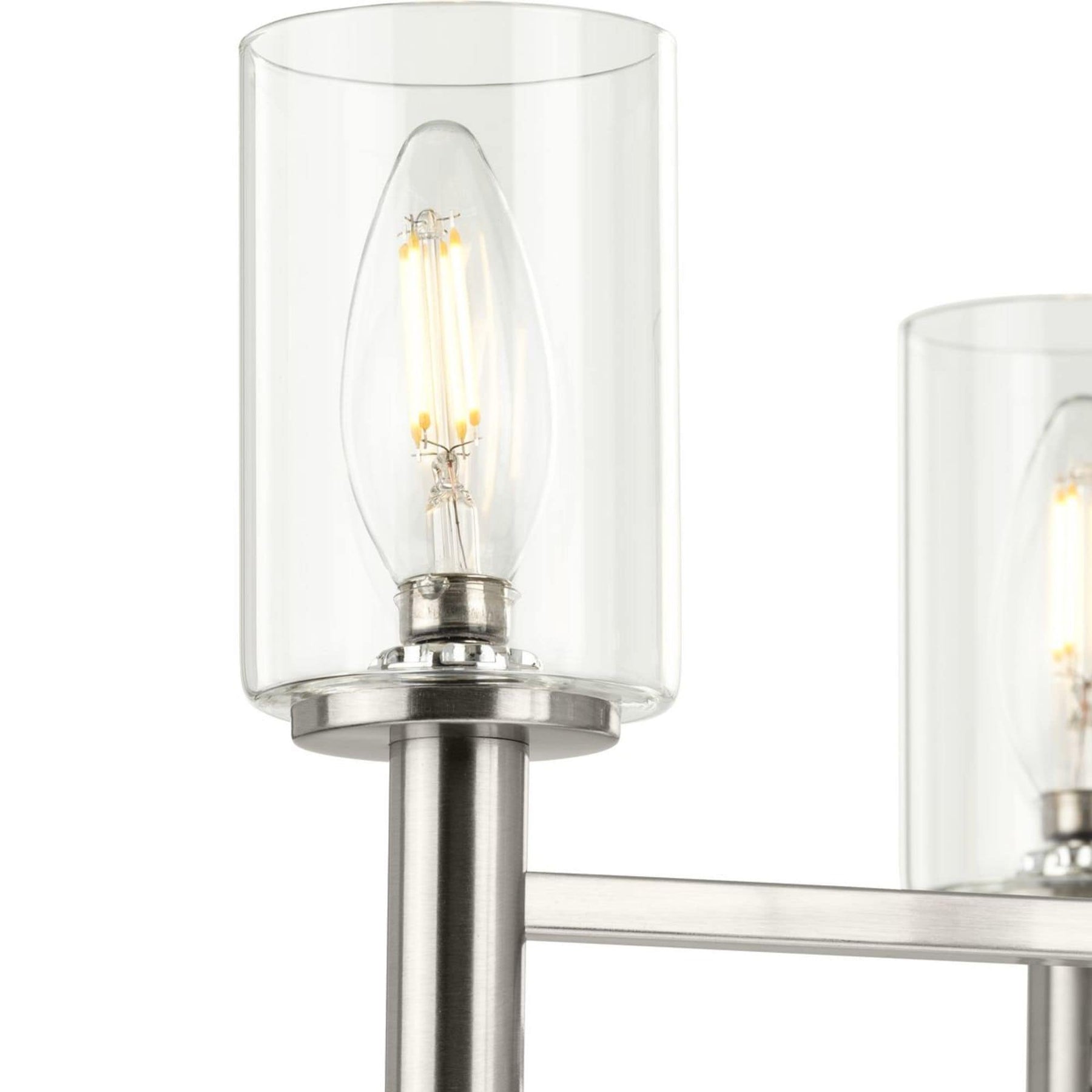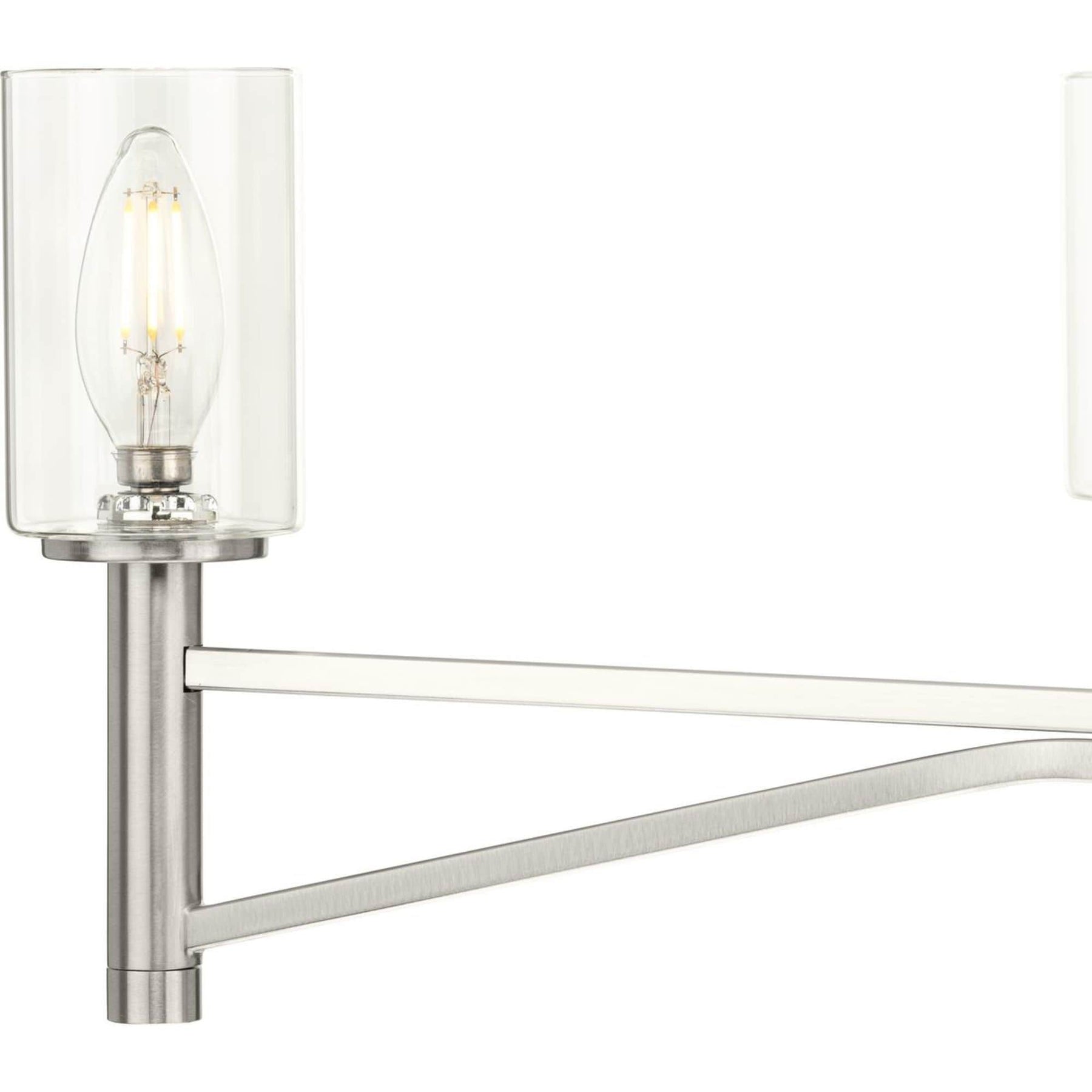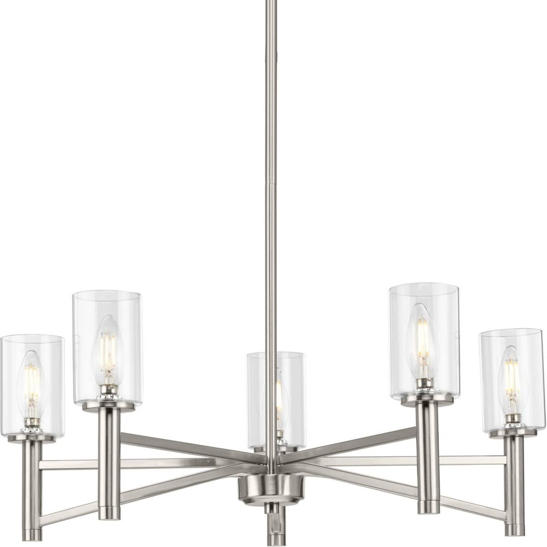 Elevate your modern living space with the chic Roxobel 5-Light Brushed Nickel Chandelier from Progress Lighting. This contemporary fixture boasts a striking geometric design with angular bars and clear glass shades, delivering both style and sophisticated ambient lighting. Perfect for dining rooms, kitchens, or living spaces seeking a touch of modern elegance.