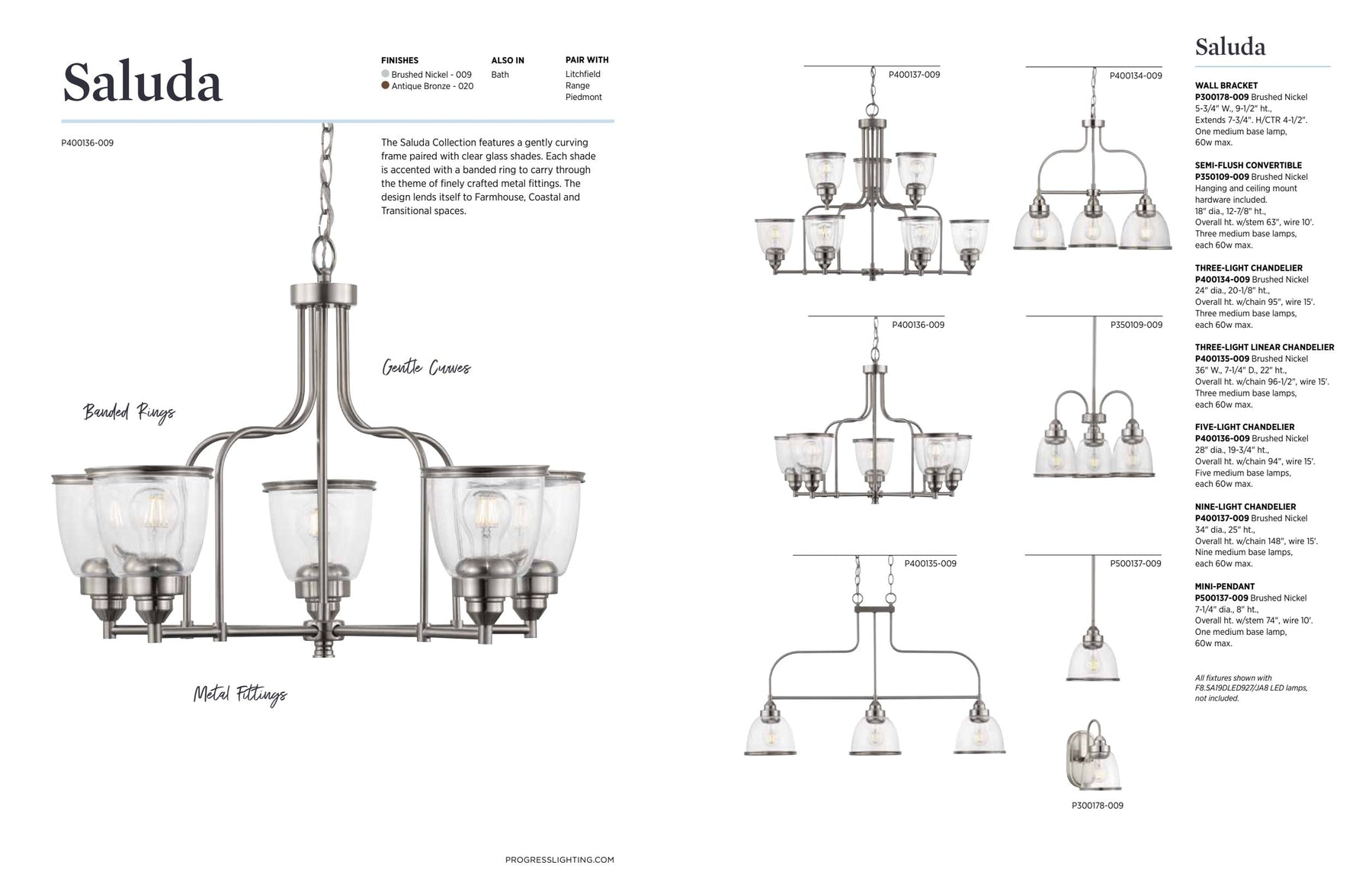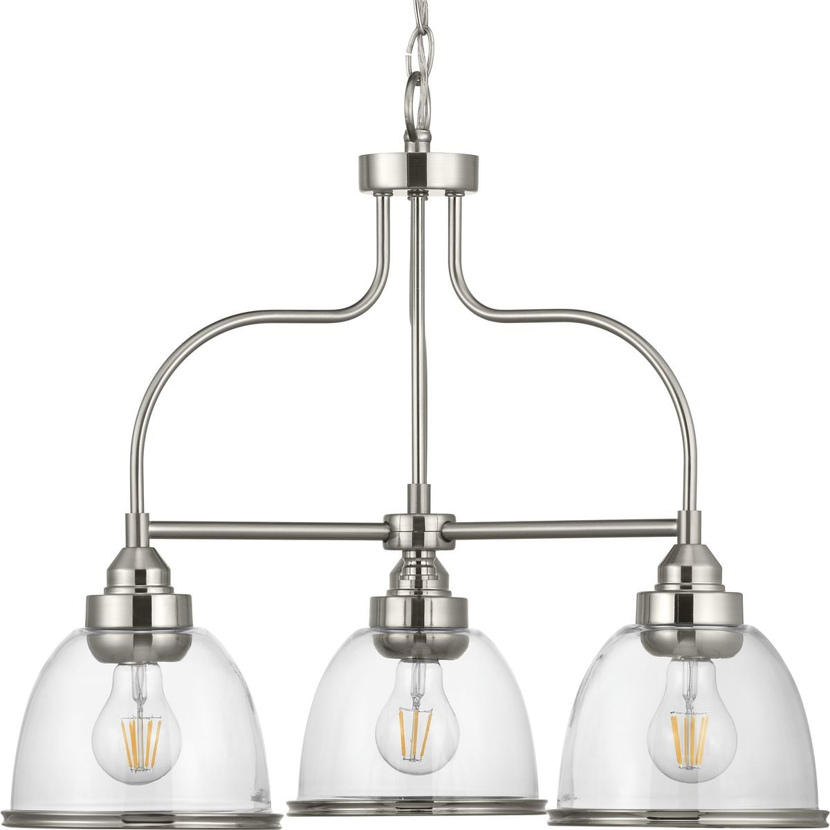 Illuminate your space with the elegant Saluda 3-Light Chandelier by Progress Lighting. With its brushed nickel finish and clear glass shades, this transitional fixture brings a touch of sophistication and adaptability to any room. Perfect for kitchens, dining rooms, and foyers, it harmonizes style with functional luminosity.