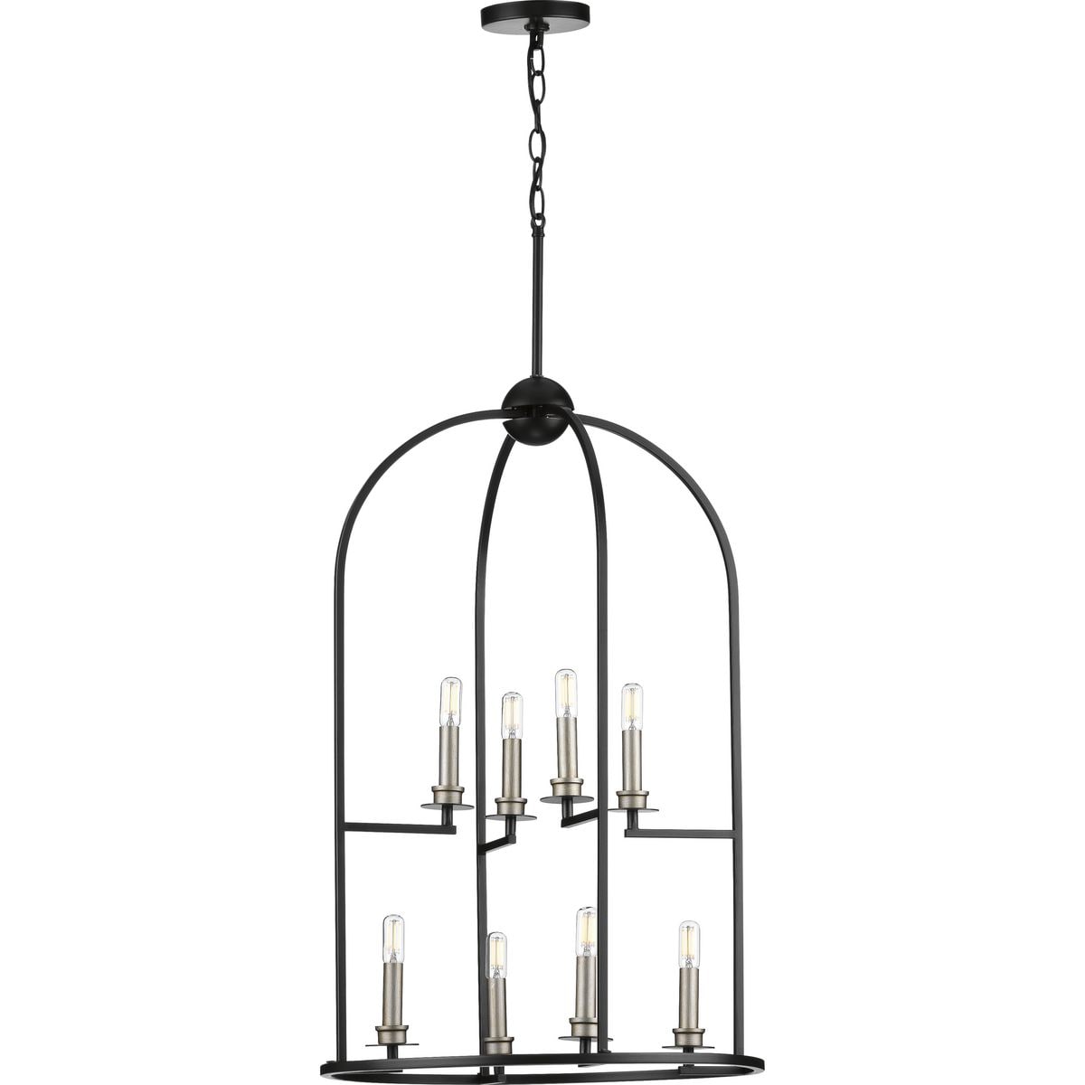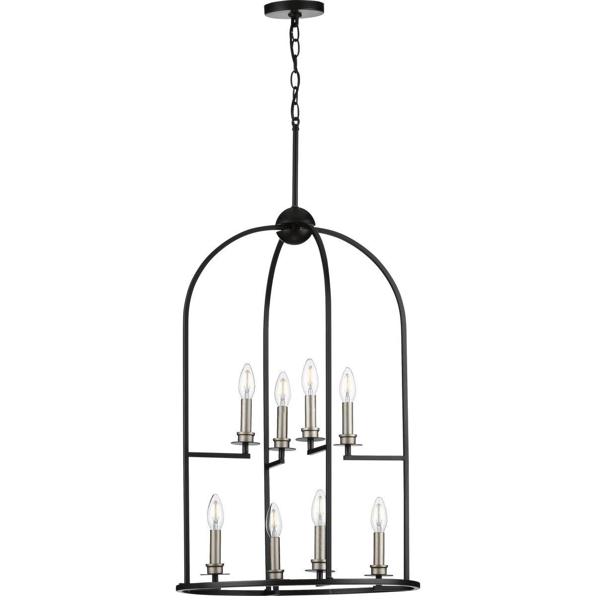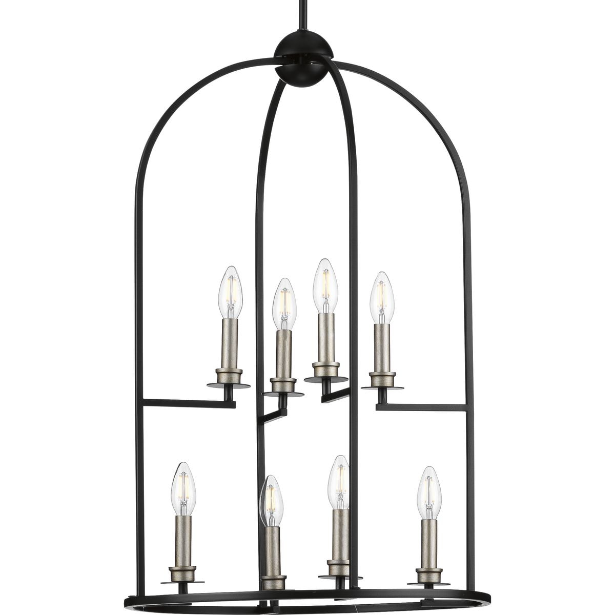 Illuminate your home with the Seneca 8-Light Farmhouse Lantern Pendant Light, a stunning blend of modern and traditional design complemented by a classic Matte Black finish. This pendant features an elegant, open-cage design with decorative crowning orb, perfect for enhancing any bar, hall, kitchen, or foyer.