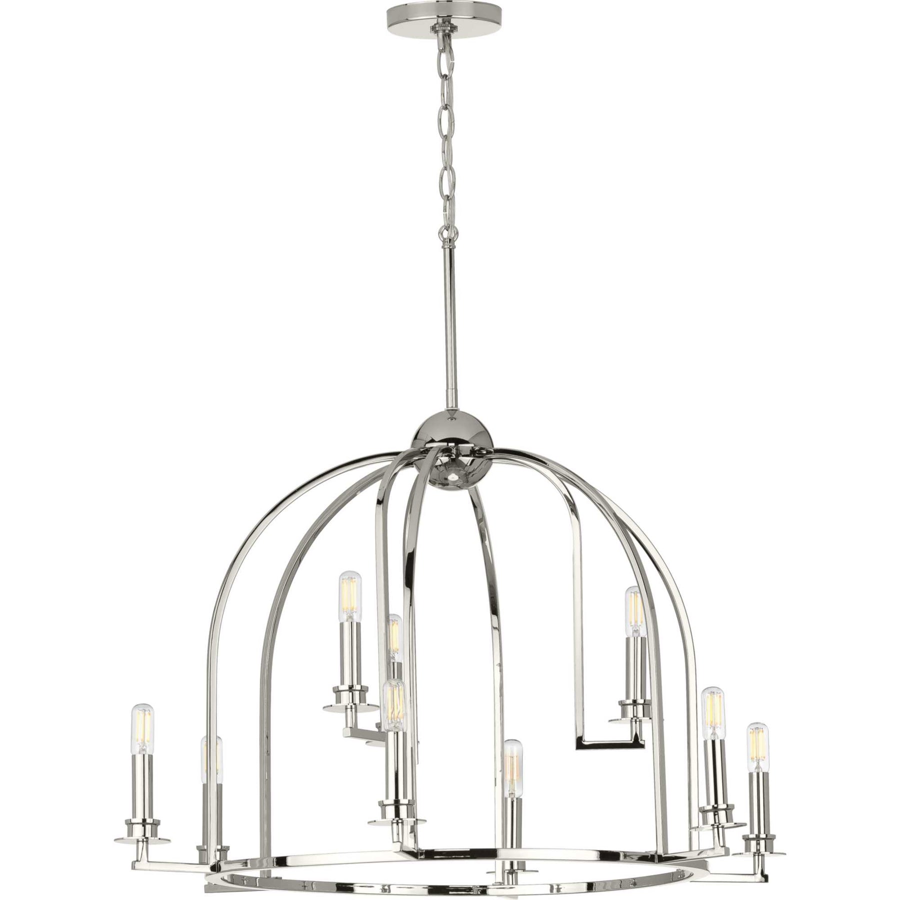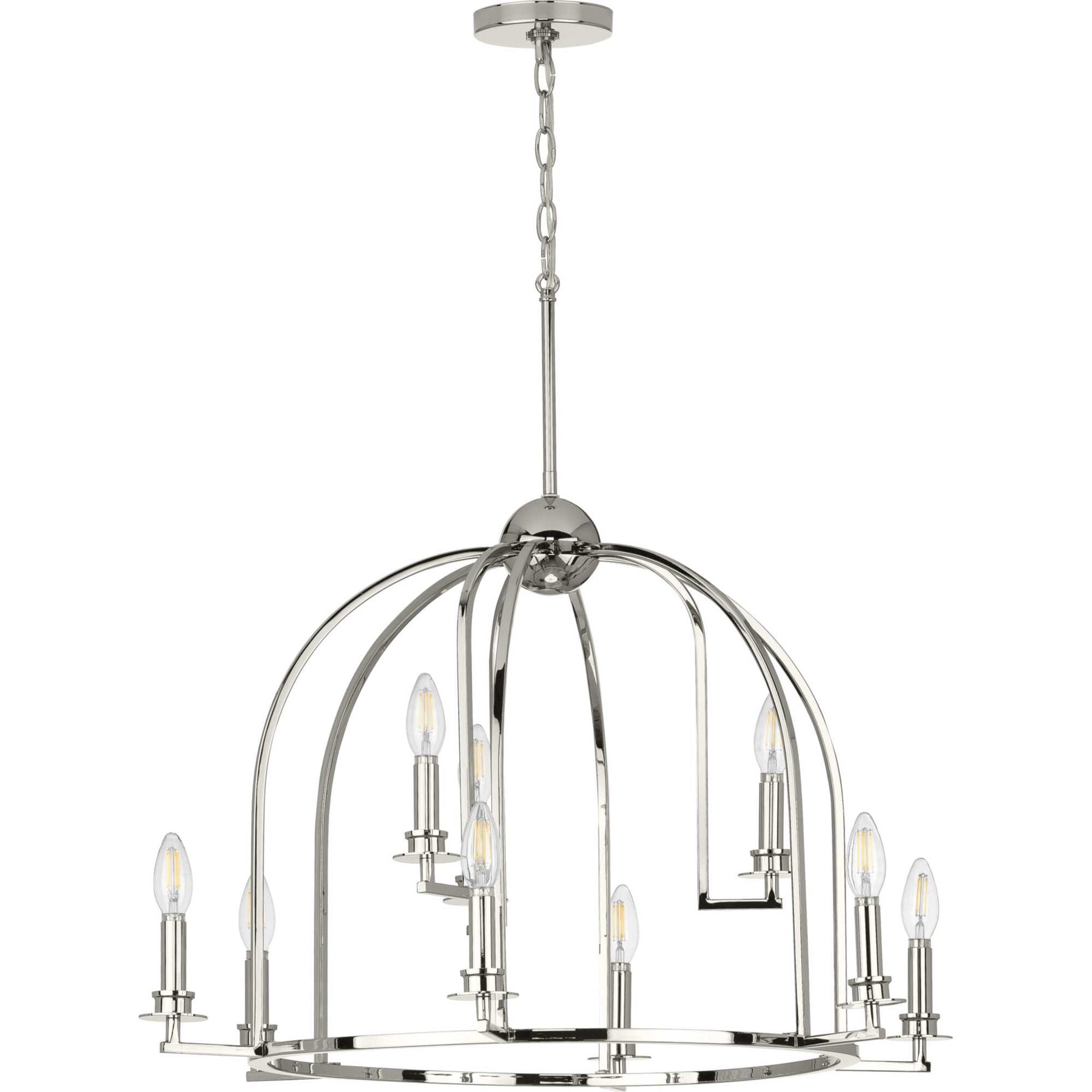 Embrace the elegance of modern farmhouse style with the Seneca 9-Light Chandelier by Progress Lighting. Featuring a polished nickel finish and sleek flowing arms, this chandelier exudes sophistication while becoming the centerpiece of any room. Perfectly adaptable to various ceiling heights, it's an essential addition to your dining room, foyer, or living space.