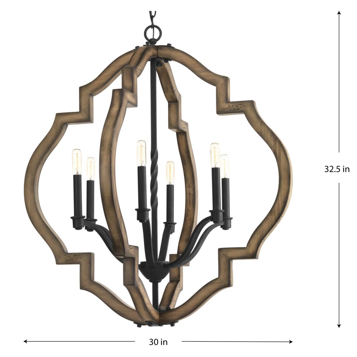 The Spicewood 6-Light Black Farmhouse Chandelier is a striking statement piece that effortlessly merges rustic charm with modern appeal. Crafted with a rich, solid wood frame in a classic quatrefoil design, it is enhanced with wrought iron metal fittings and a gilded iron finish, perfect for a farmhouse or urban industrial aesthetic.