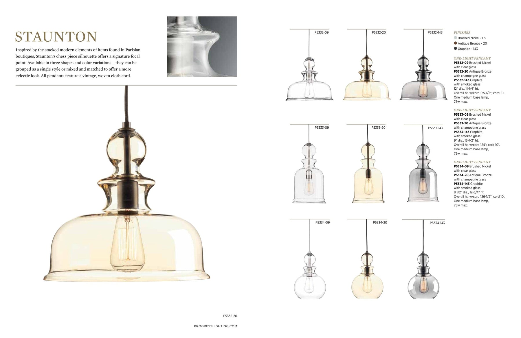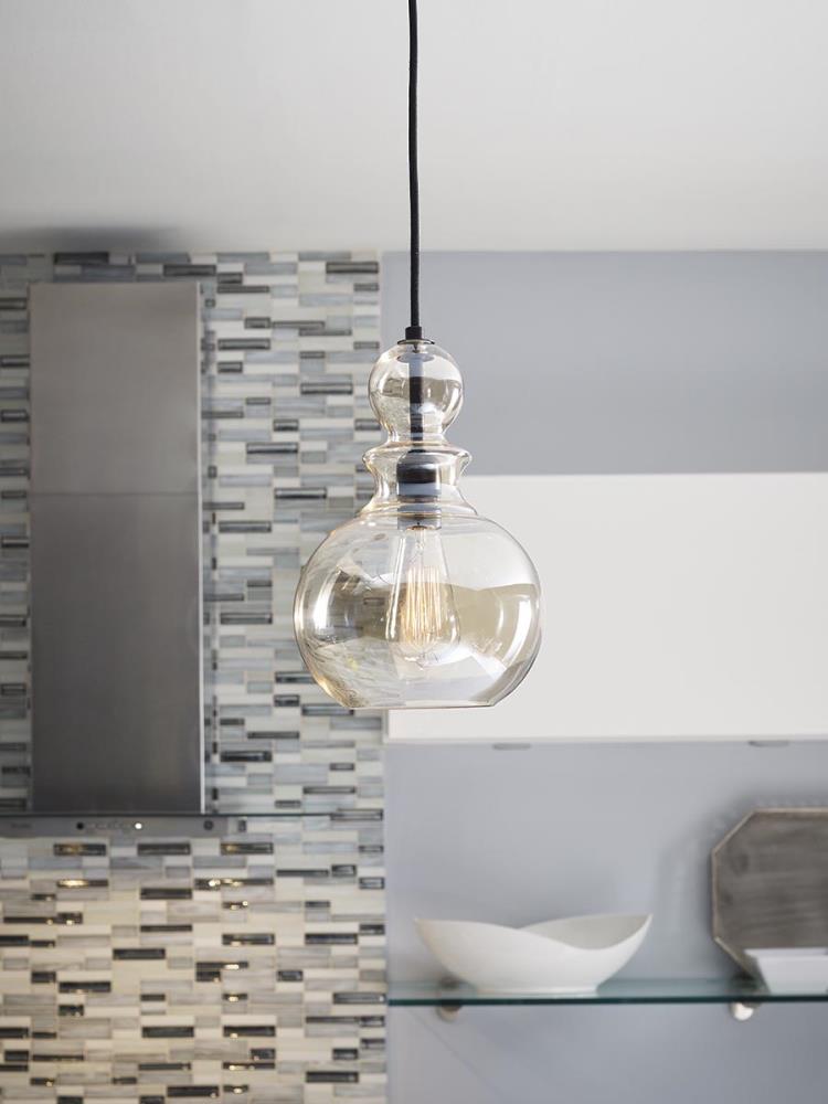 A: The Staunton Pendant Light features a tinted champagne glass globe, which beautifully softens and diffuses the light.