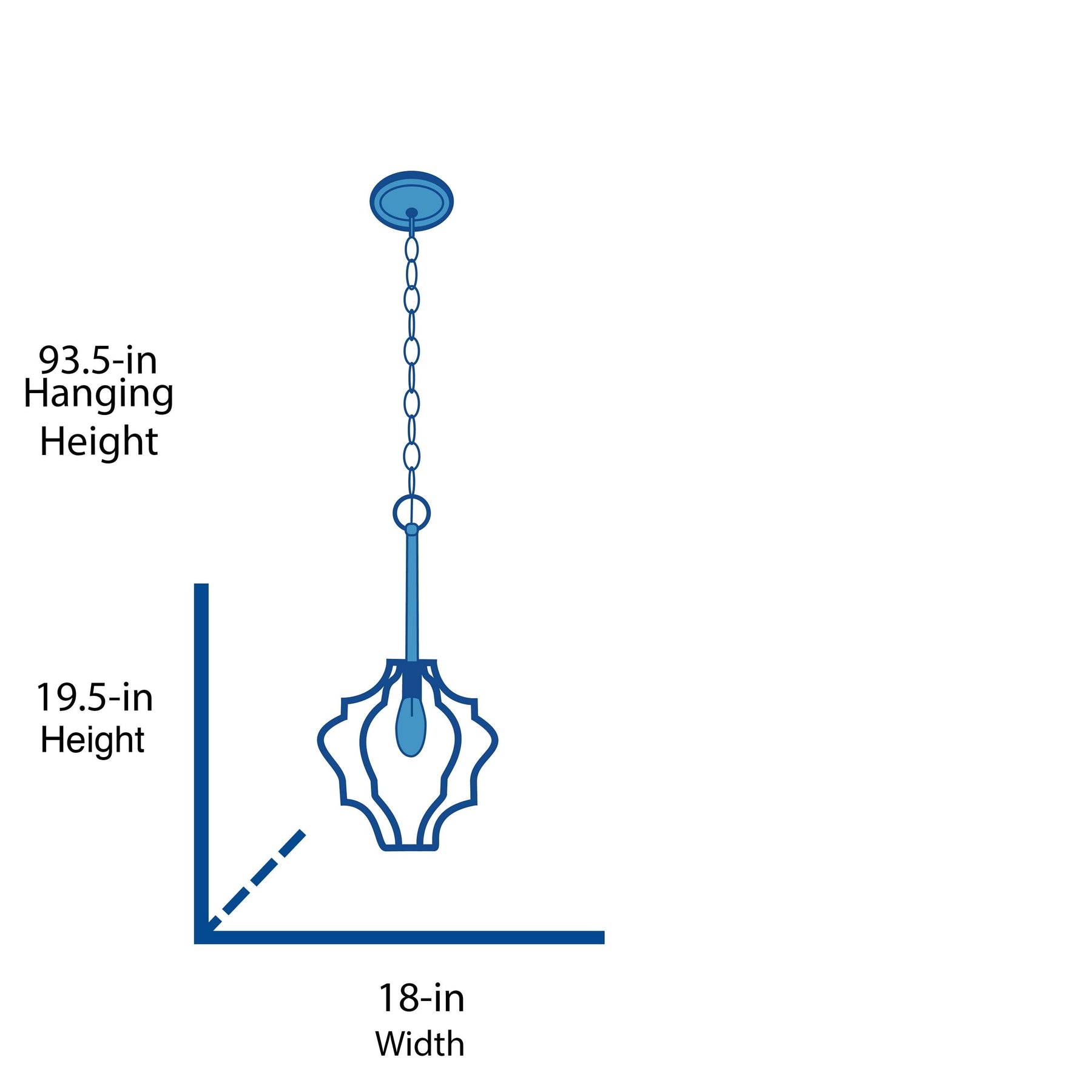 A: The pendant measures 18 inches in diameter and 19.5 inches in height, with a maximum hanging height of 93.5 inches.