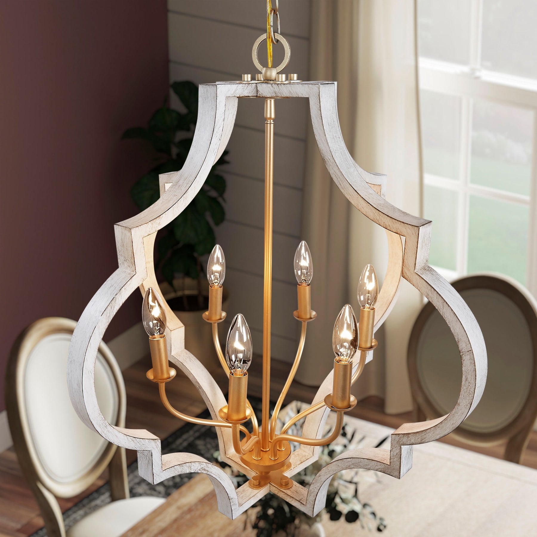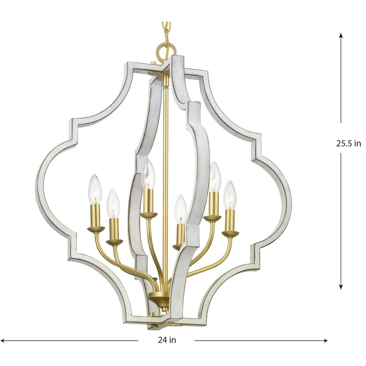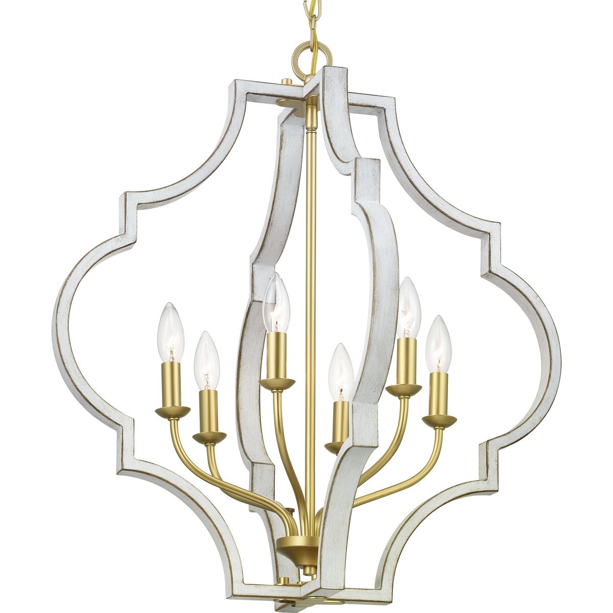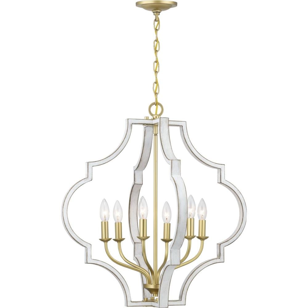 Illuminate your space with the Teigen 6-Light Transitional Pendant Light, featuring a stunning open-cage quattro-foil frame that marries antique white with vintage gold for a timeless appeal. This fixture seamlessly combines traditional elegance with modern flair, creating a captivating centerpiece suitable for any interior style.