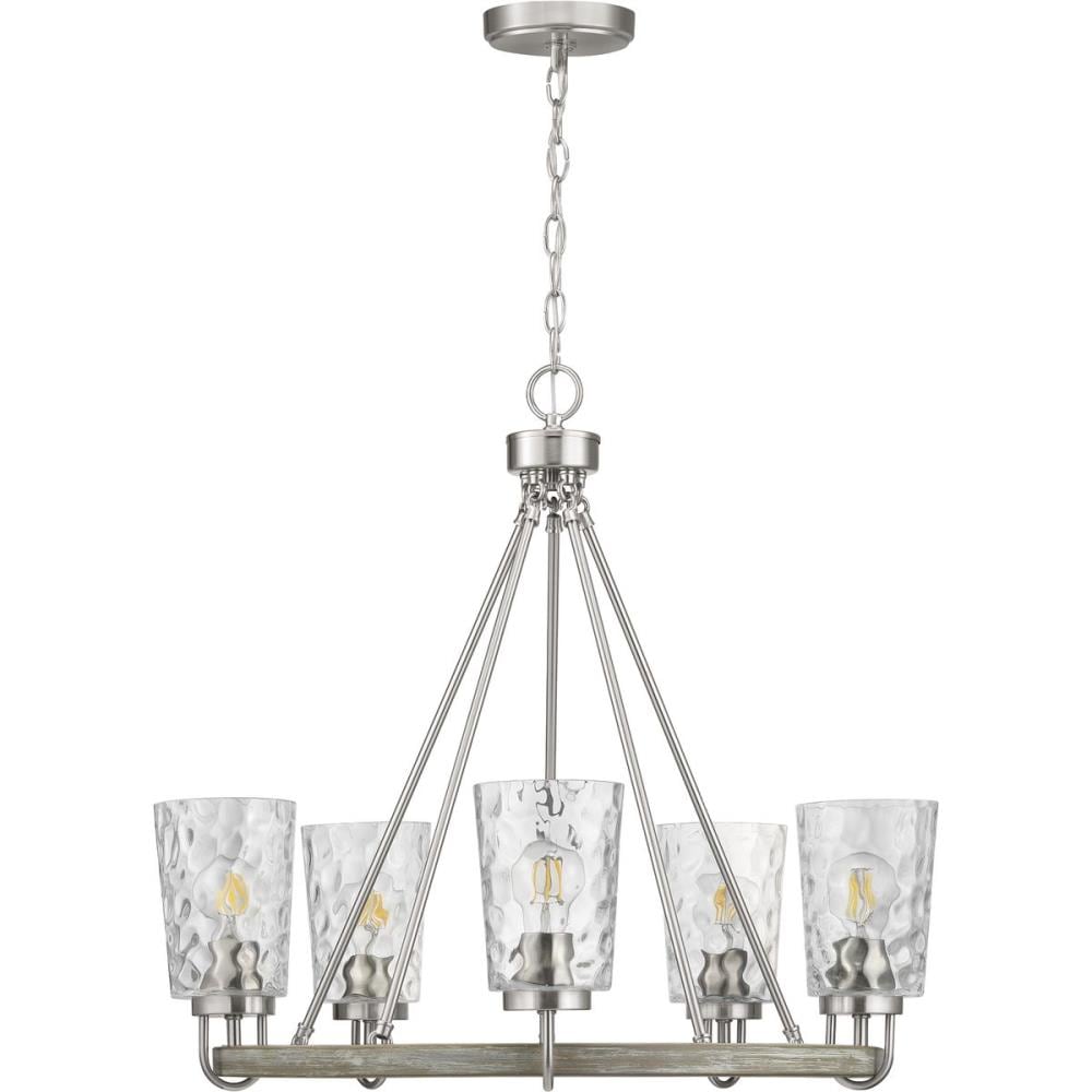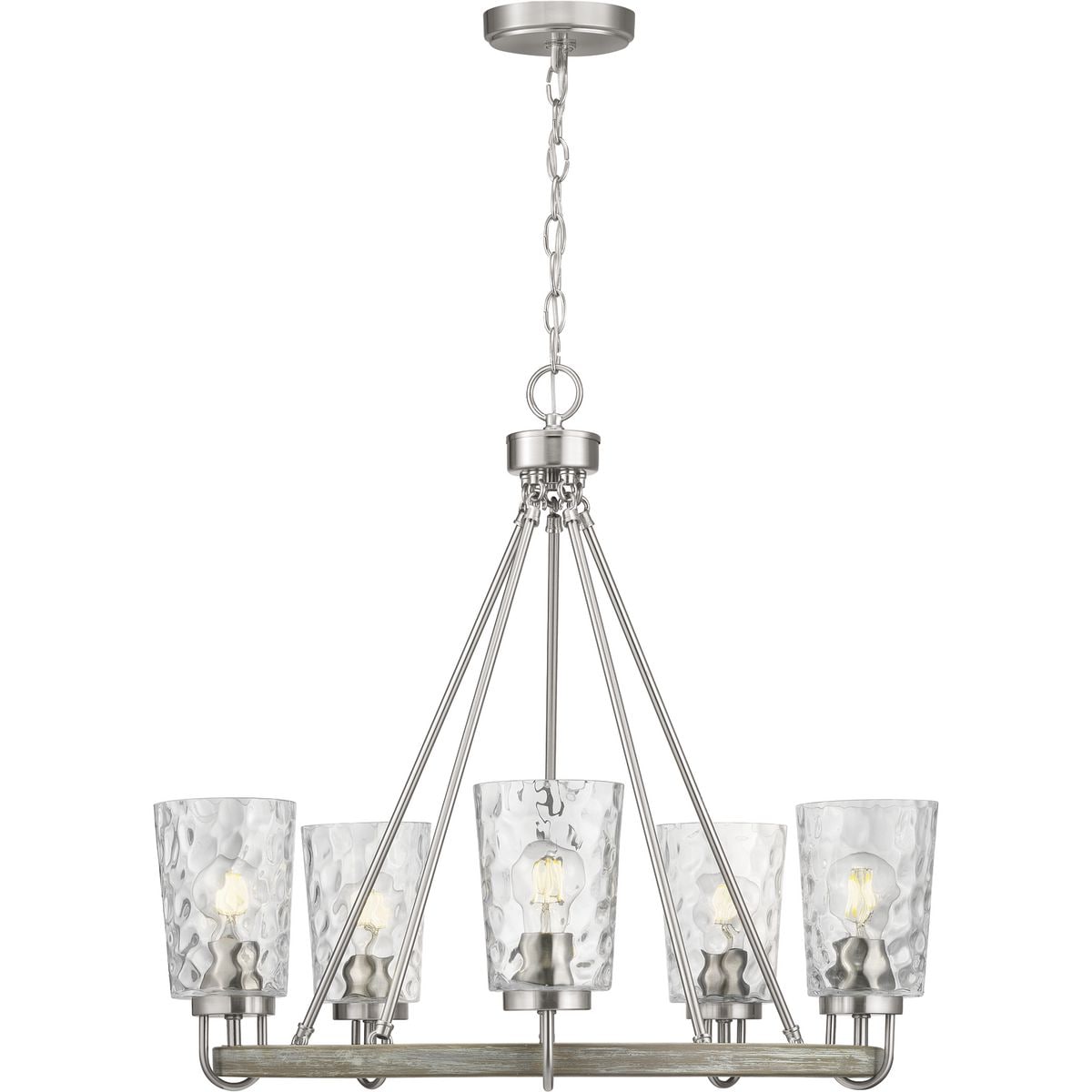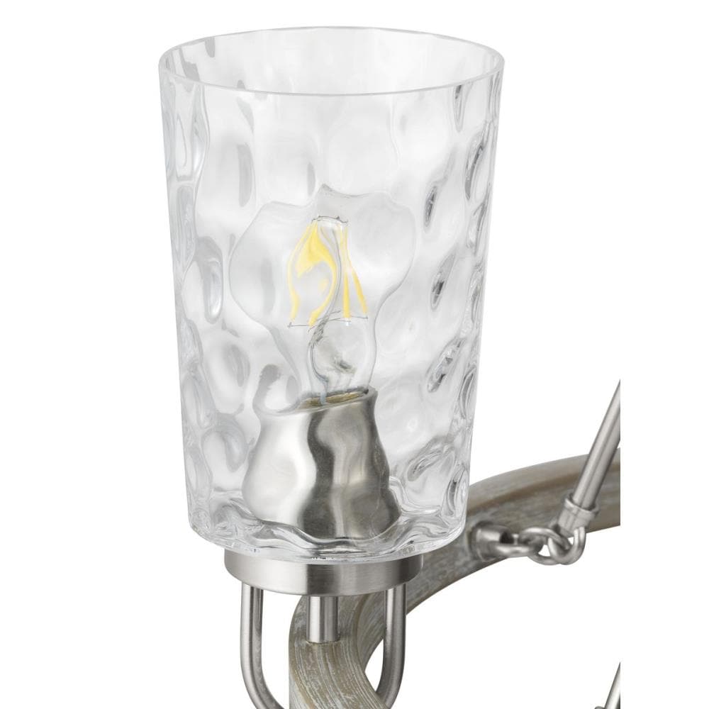 Elevate your space with the Tiana 5-Light Brushed Nickel Coastal Chandelier. This stunning fixture combines classic design with modern elegance, featuring a unique two-toned driftwood and brushed nickel frame adorned with clear water glass shades. Perfect for adding an ethereal glow to any room in your home.