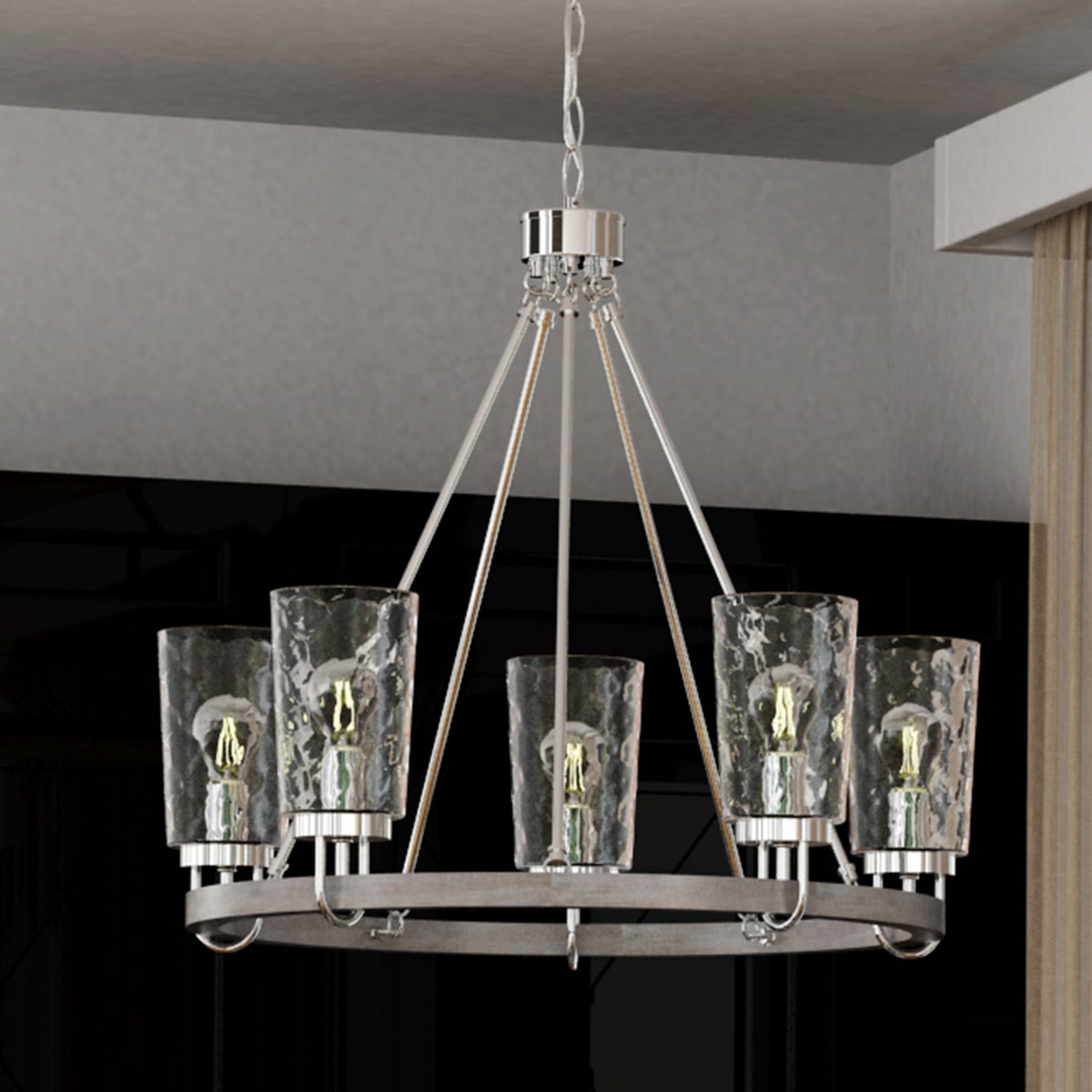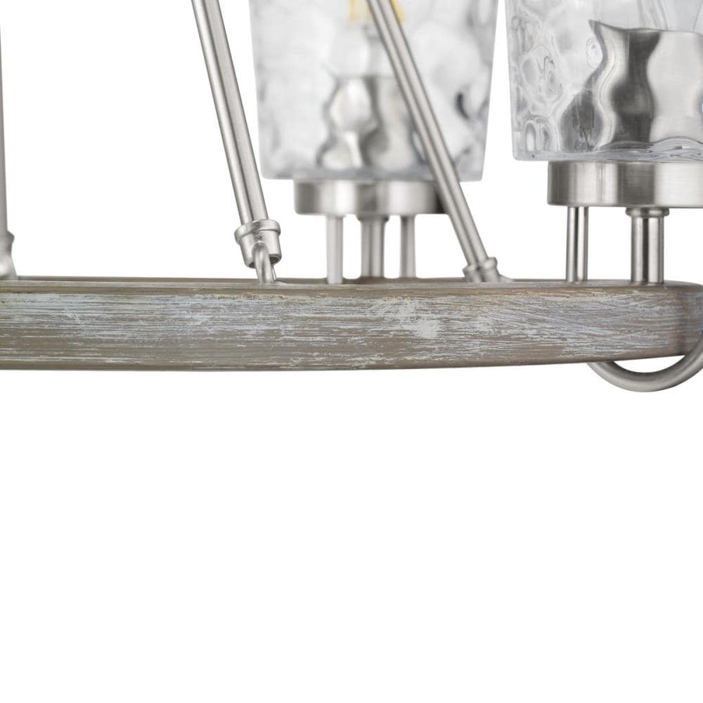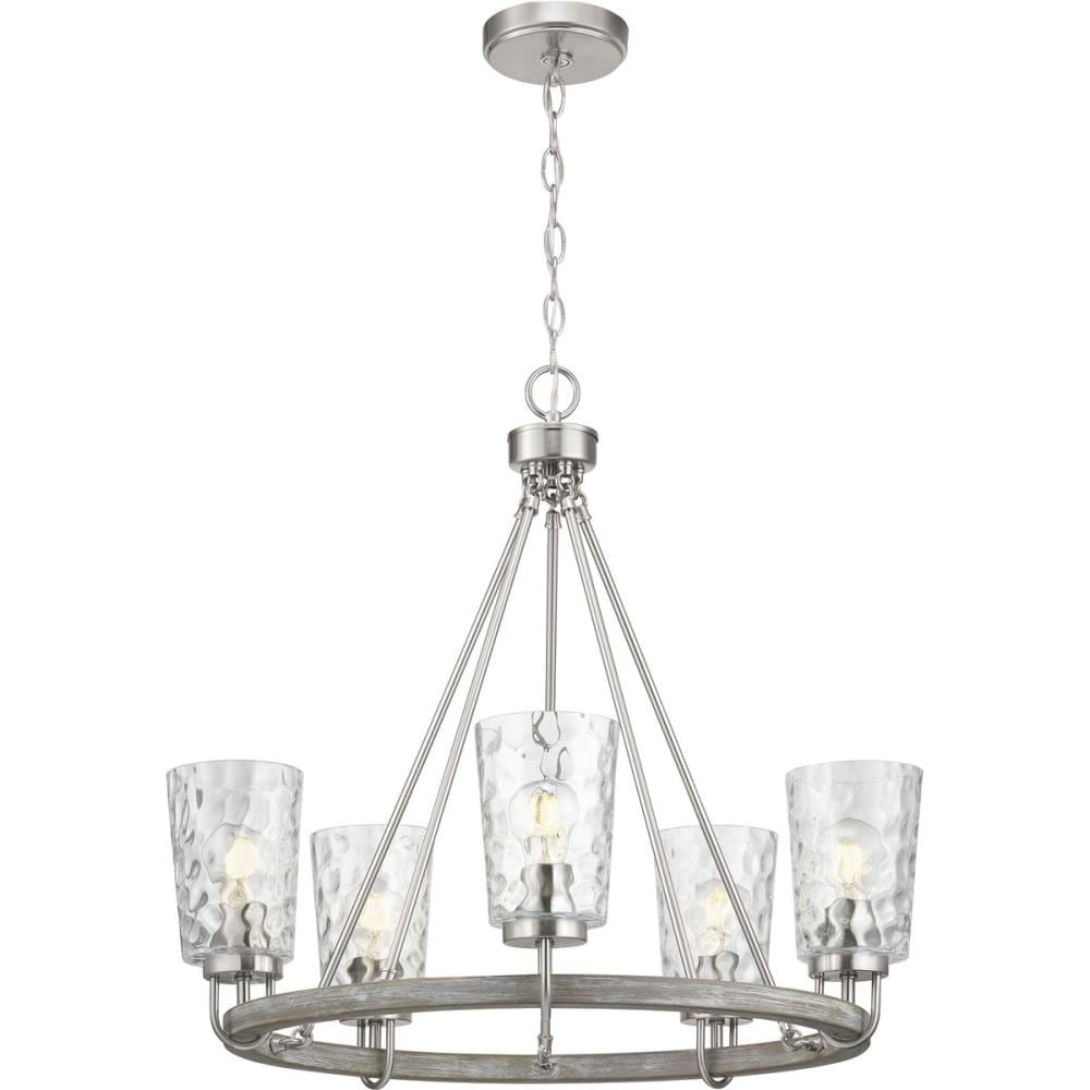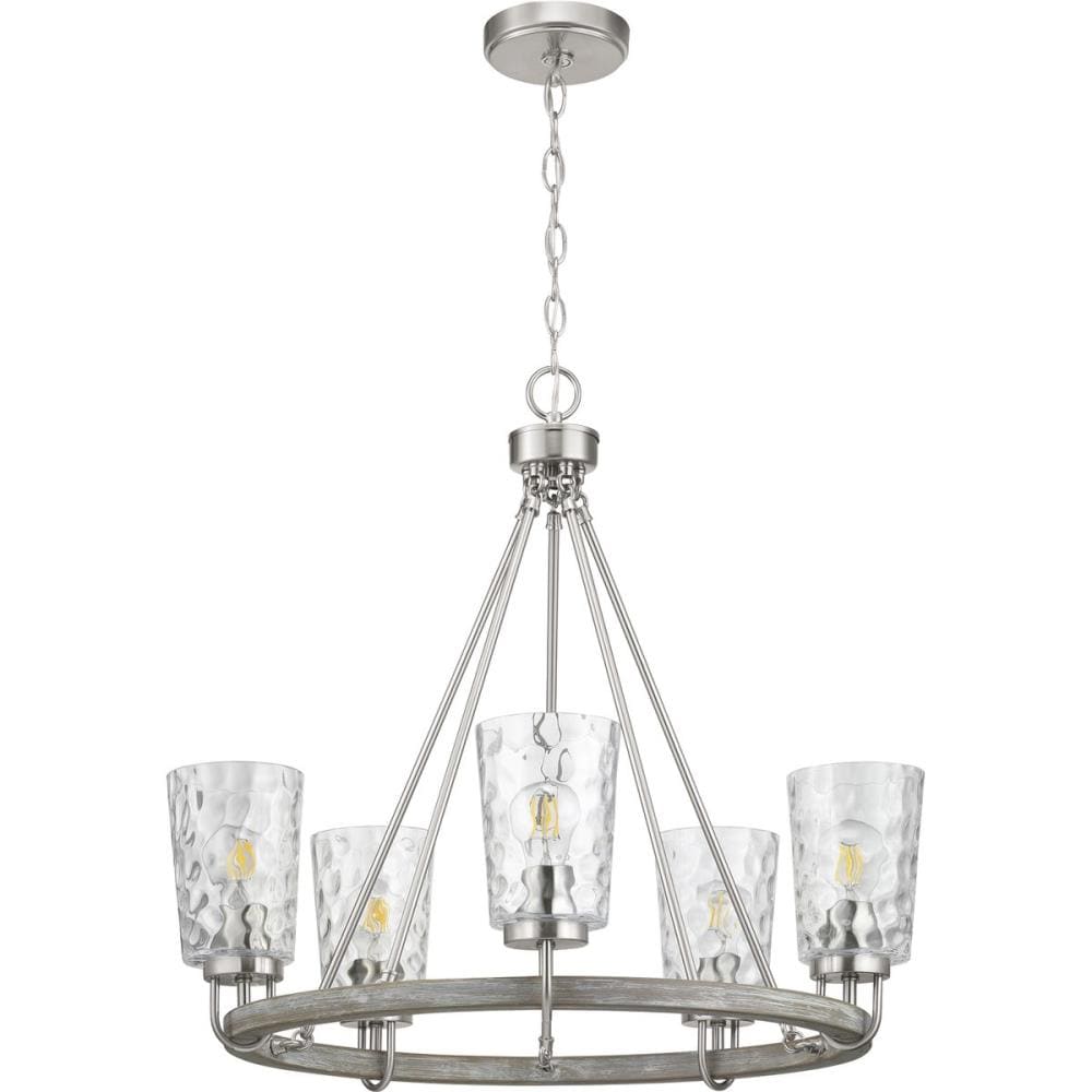 Elevate your space with the Tiana 5-Light Brushed Nickel Coastal Chandelier. This stunning fixture combines classic design with modern elegance, featuring a unique two-toned driftwood and brushed nickel frame adorned with clear water glass shades. Perfect for adding an ethereal glow to any room in your home.