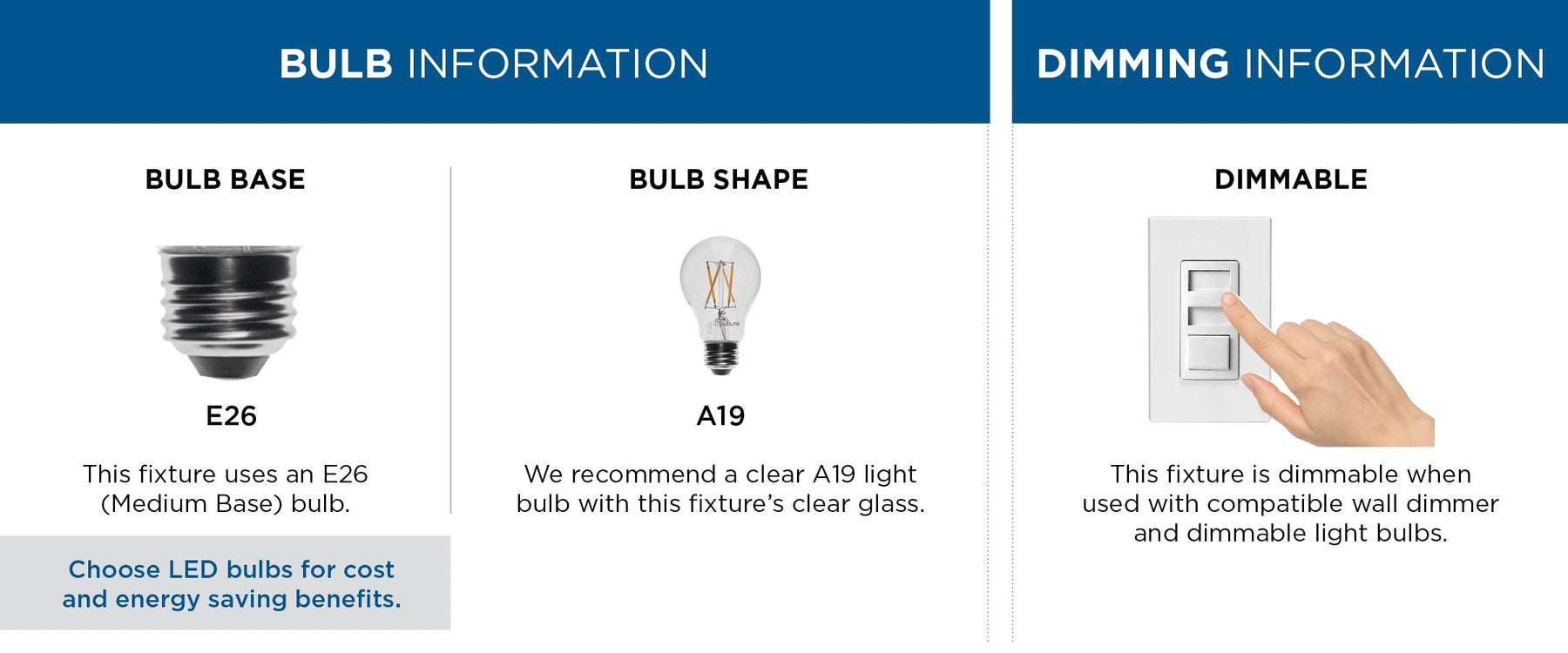 A: This chandelier uses five medium base (E-26) bulbs up to 60 watts each, such as A19 incandescent or LED bulbs.