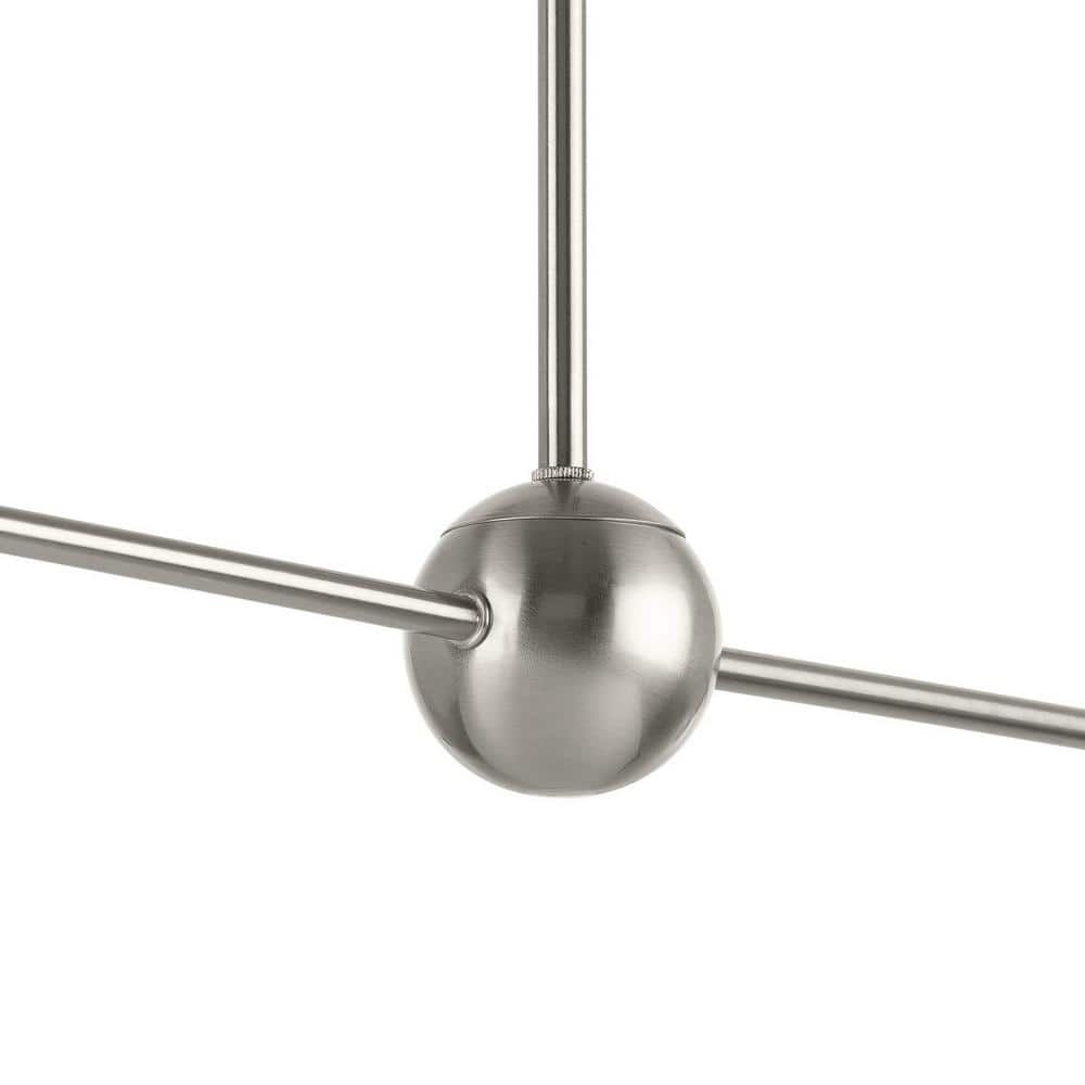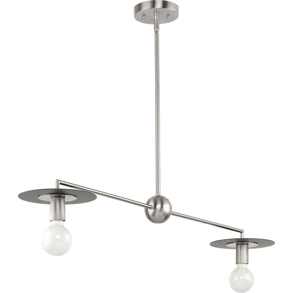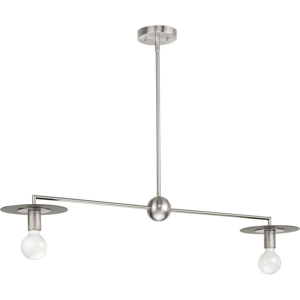 Elevate your space with the Trimble 2-Light Brushed Nickel Linear Chandelier. This stylish fixture merges luxe industrial and mid-century modern aesthetics, perfect for brightening kitchens, bars, and dining areas with its dual-toned finish and unique flat disc shades.