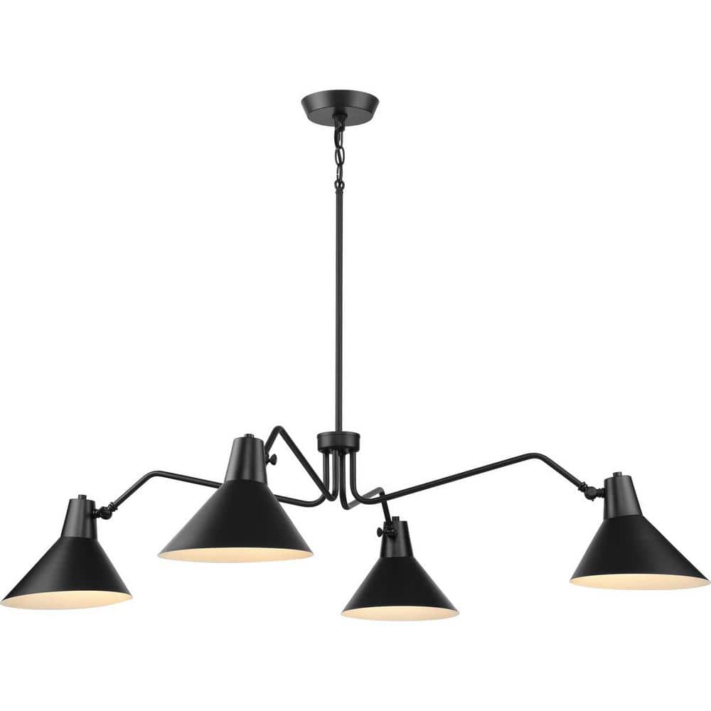 The Progress Lighting Trimble Collection 4-Light Matte Black Chandelier offers a striking design inspired by mid-century modern aesthetics. With its angular metal shades and dramatic matte black finish, this chandelier is perfect for enhancing the ambiance of any modern space. Ideal for living rooms, dining rooms, or bedrooms, it provides versatile and elegant lighting solutions for contemporary home decor.