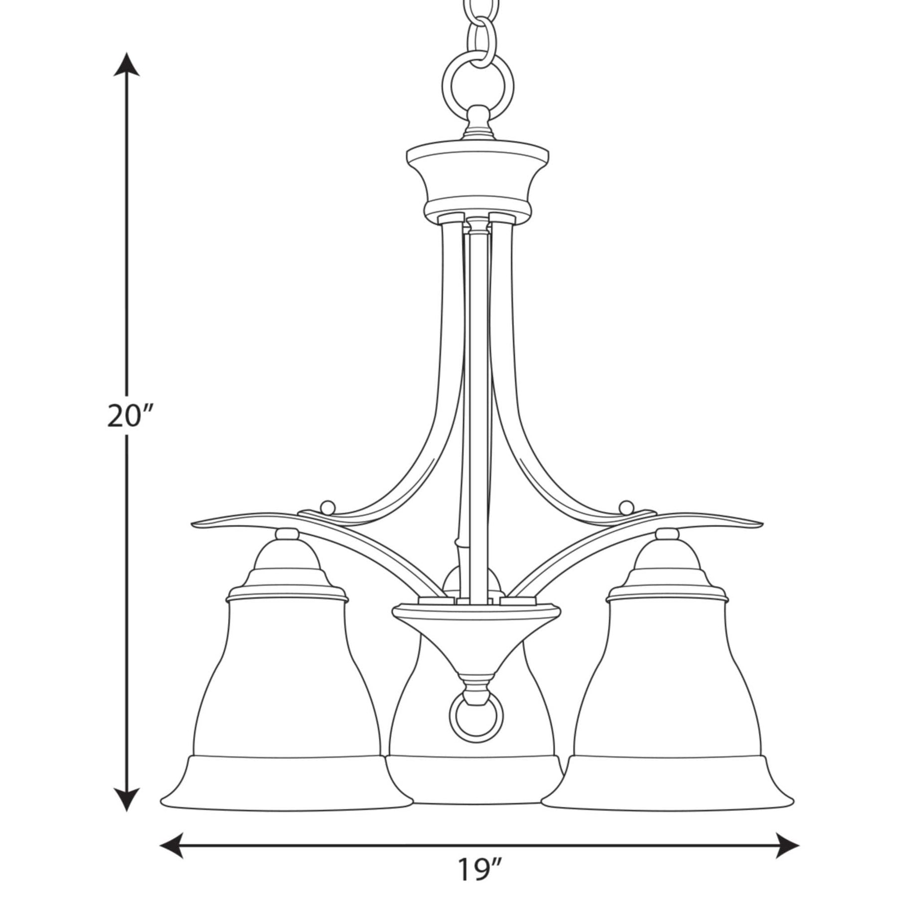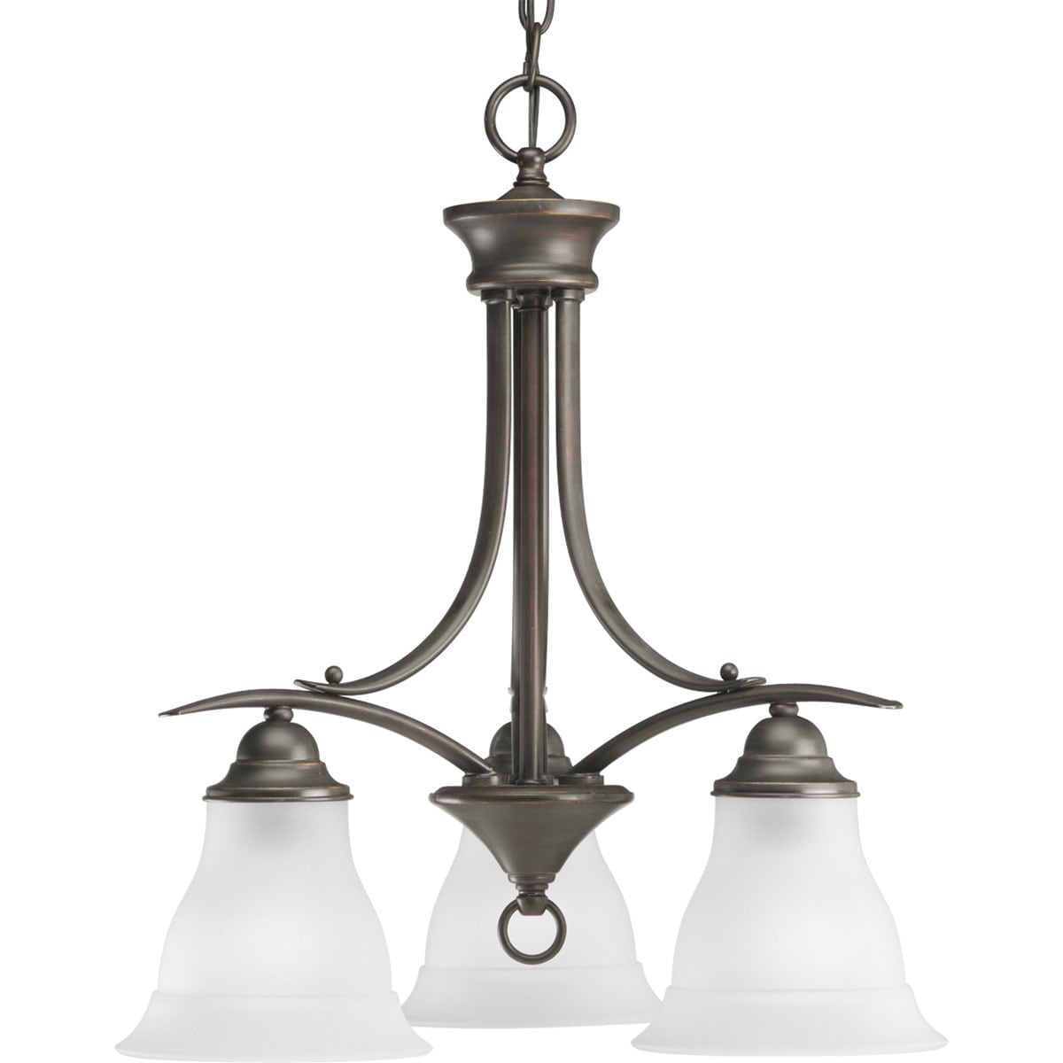 Illuminate your space with the elegant Trinity 3-Light Chandelier from Progress Lighting. This antique bronze chandelier embodies transitional style with its soft curves and sophisticated etched glass shades, making it a stunning centerpiece for any room. Perfect for a dining room or bedroom, this fixture combines classic sophistication with practical illumination.