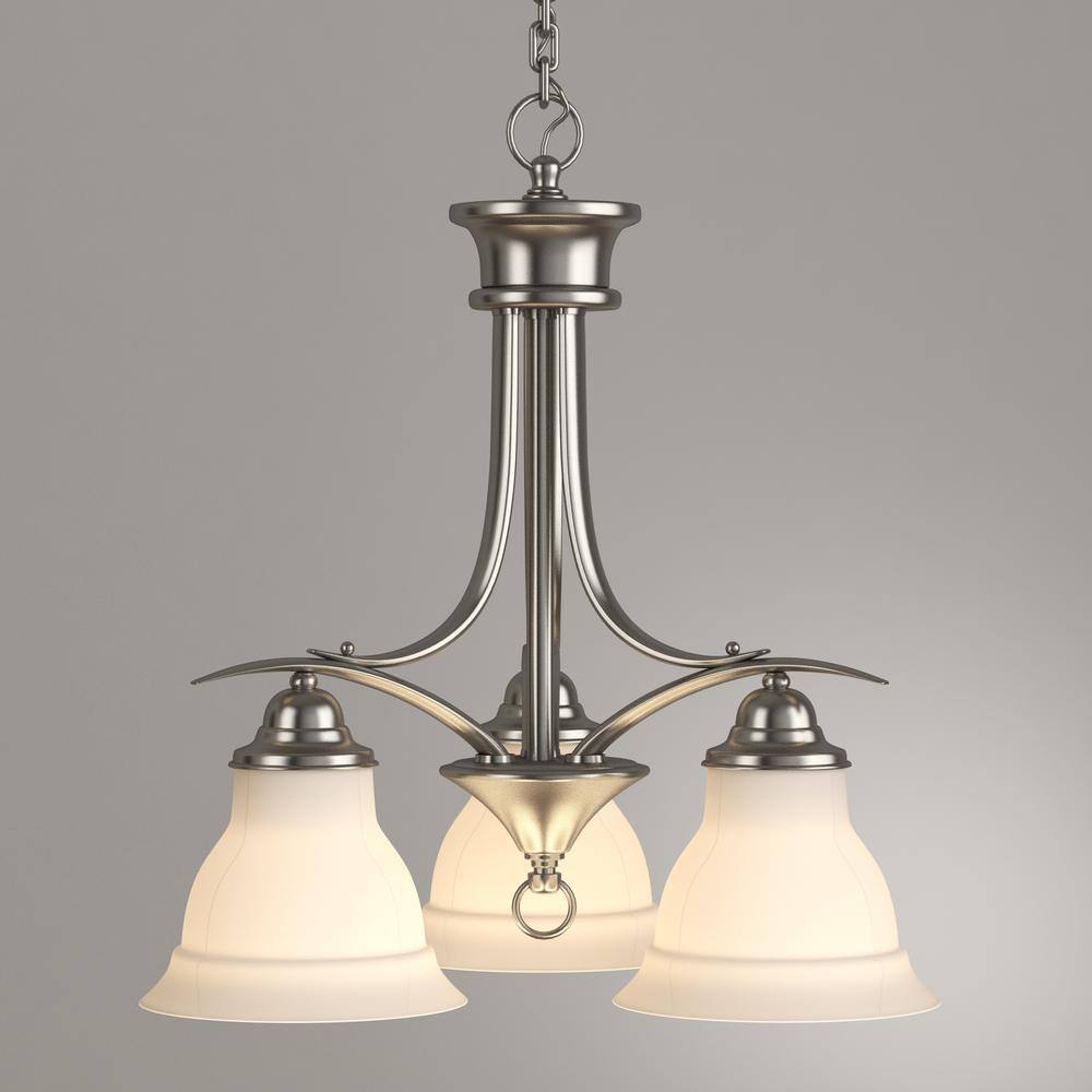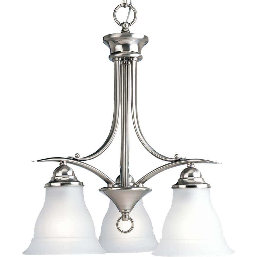 Enhance your space with the classic sophistication of the Trinity 3-Light Brushed Nickel Chandelier from Progress Lighting. Featuring sculptural forms of metal and glass, this chandelier provides a transitional style that seamlessly blends with a variety of interiors. Its brushed nickel finish and etched glass shades offer timeless elegance perfect for transforming any dining room, foyer, or living room.