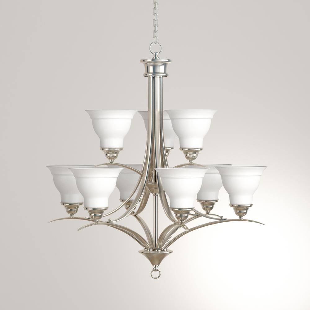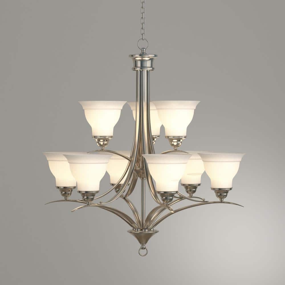 Elevate your home ambiance with the Trinity Collection 9-Light Brushed Nickel Chandelier. This statement piece combines etched glass with a sleek brushed nickel finish, offering timeless elegance suitable for dining areas, kitchens, or grand entryways.
