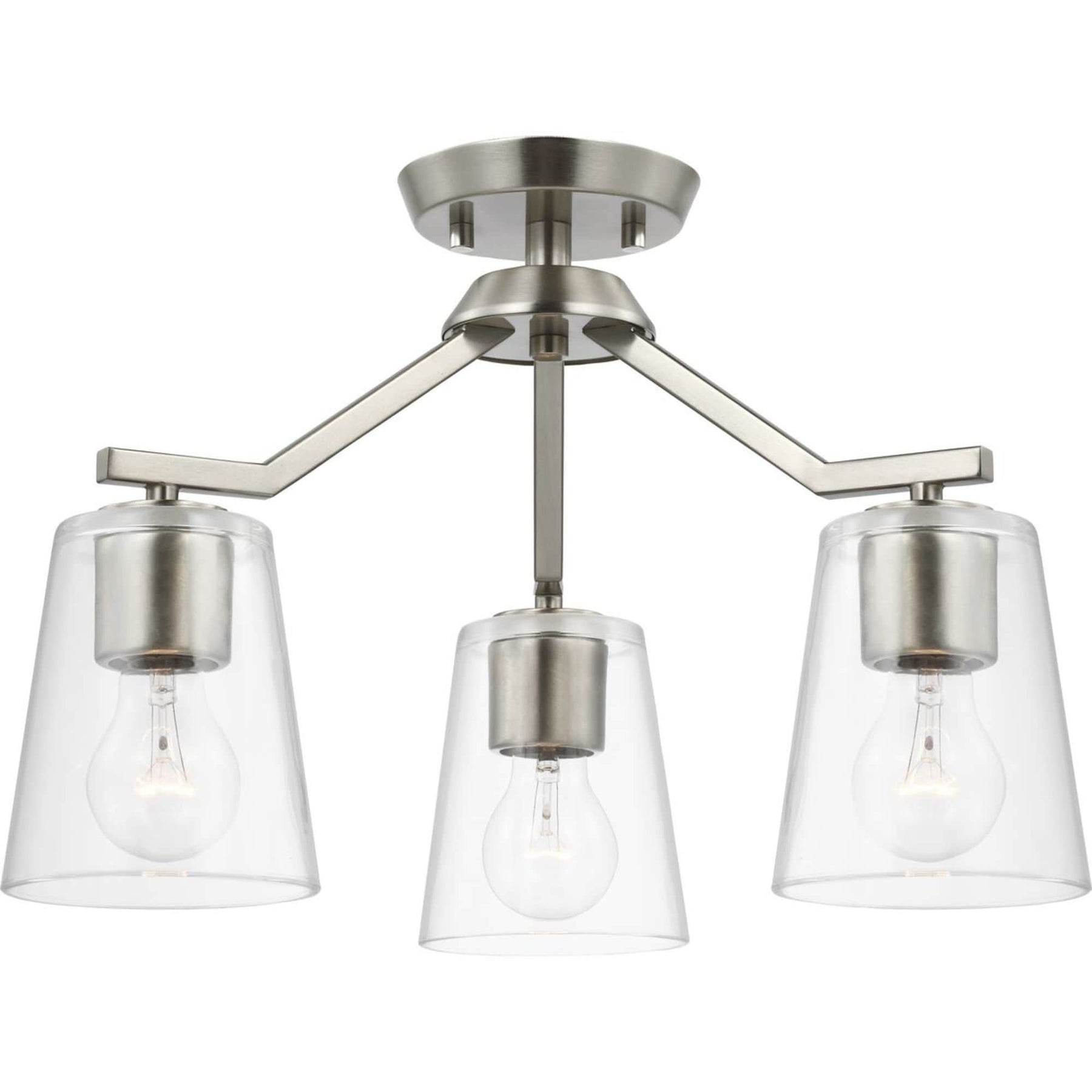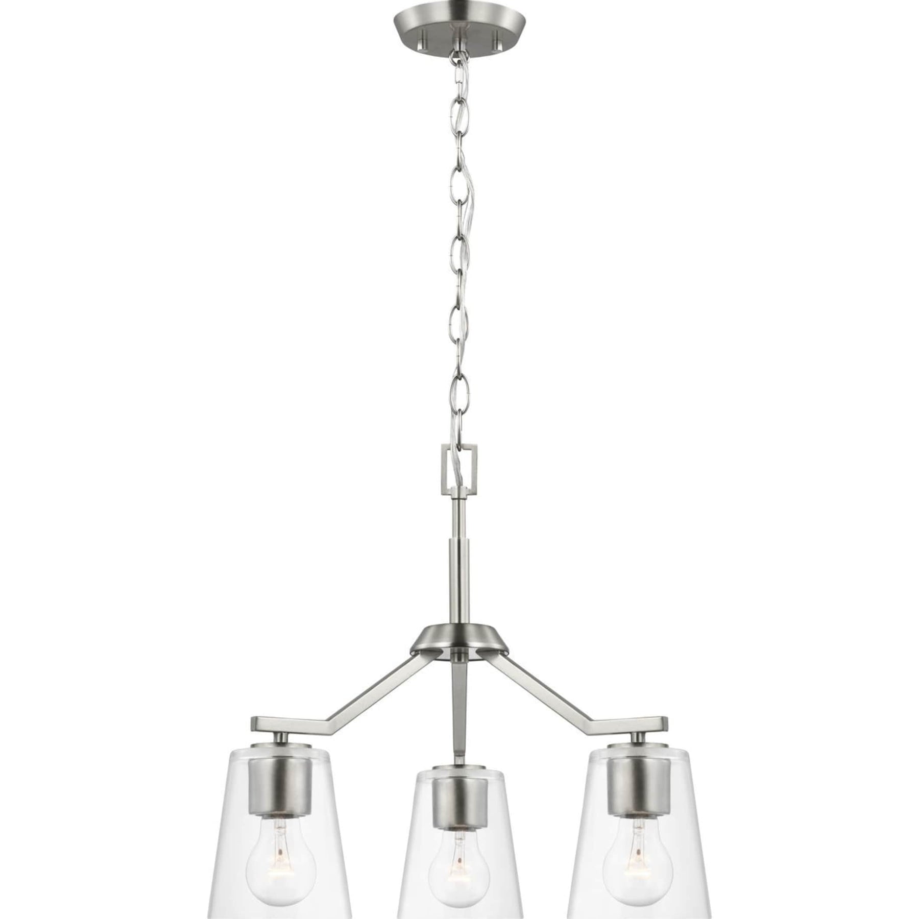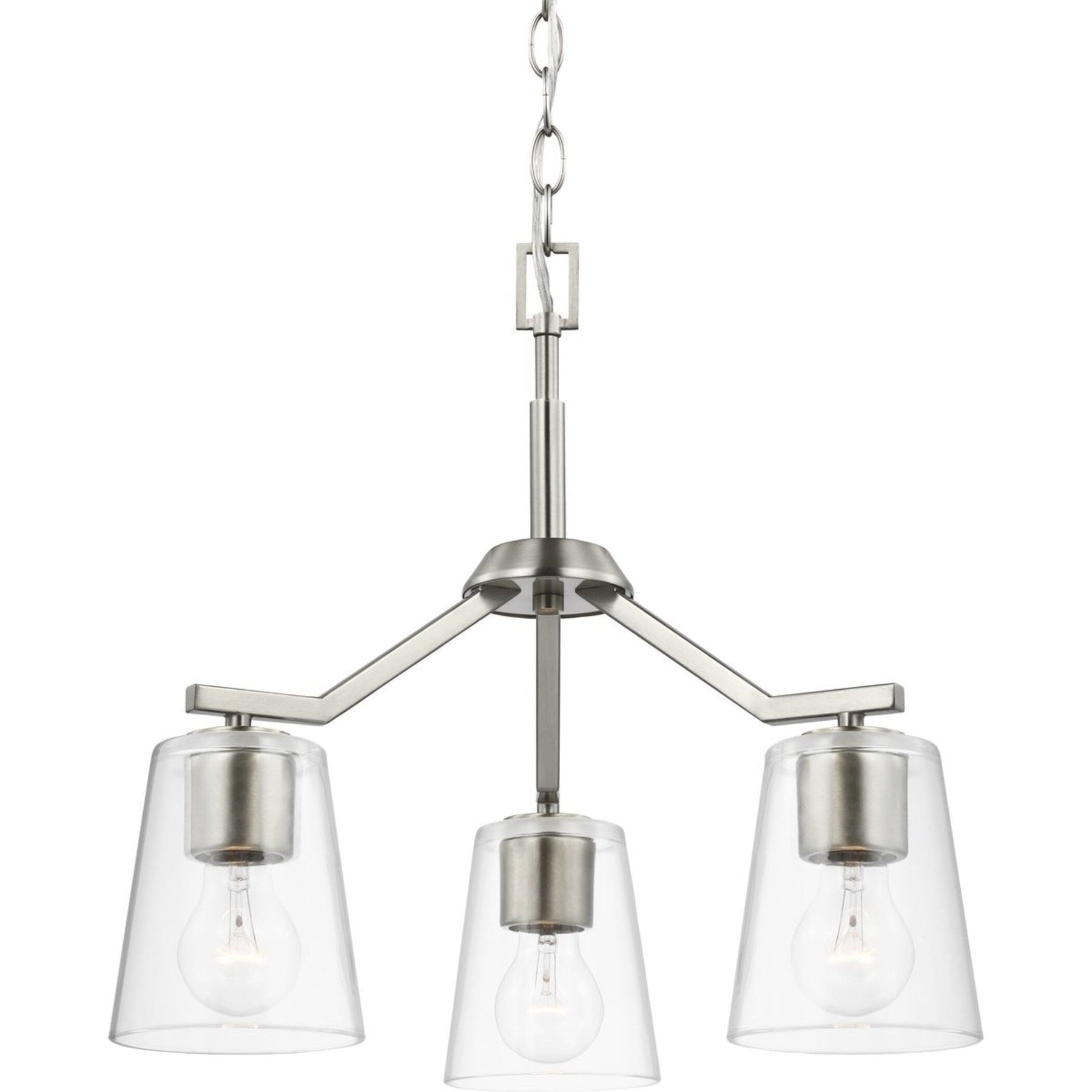 Transform your space with the Vertex 3-Light Chandelier, where modern artistry meets functional design. This piece’s bold silhouette, adorned with crisp brushed nickel, invites a striking play of light across your interiors. Its clear glass shades ensure a luminous glow, perfect for a luxurious dining experience or illuminating a chic foyer. Reimagine your space with this architectural marvel—it’s not just lighting, it's a statement of sophisticated living.
