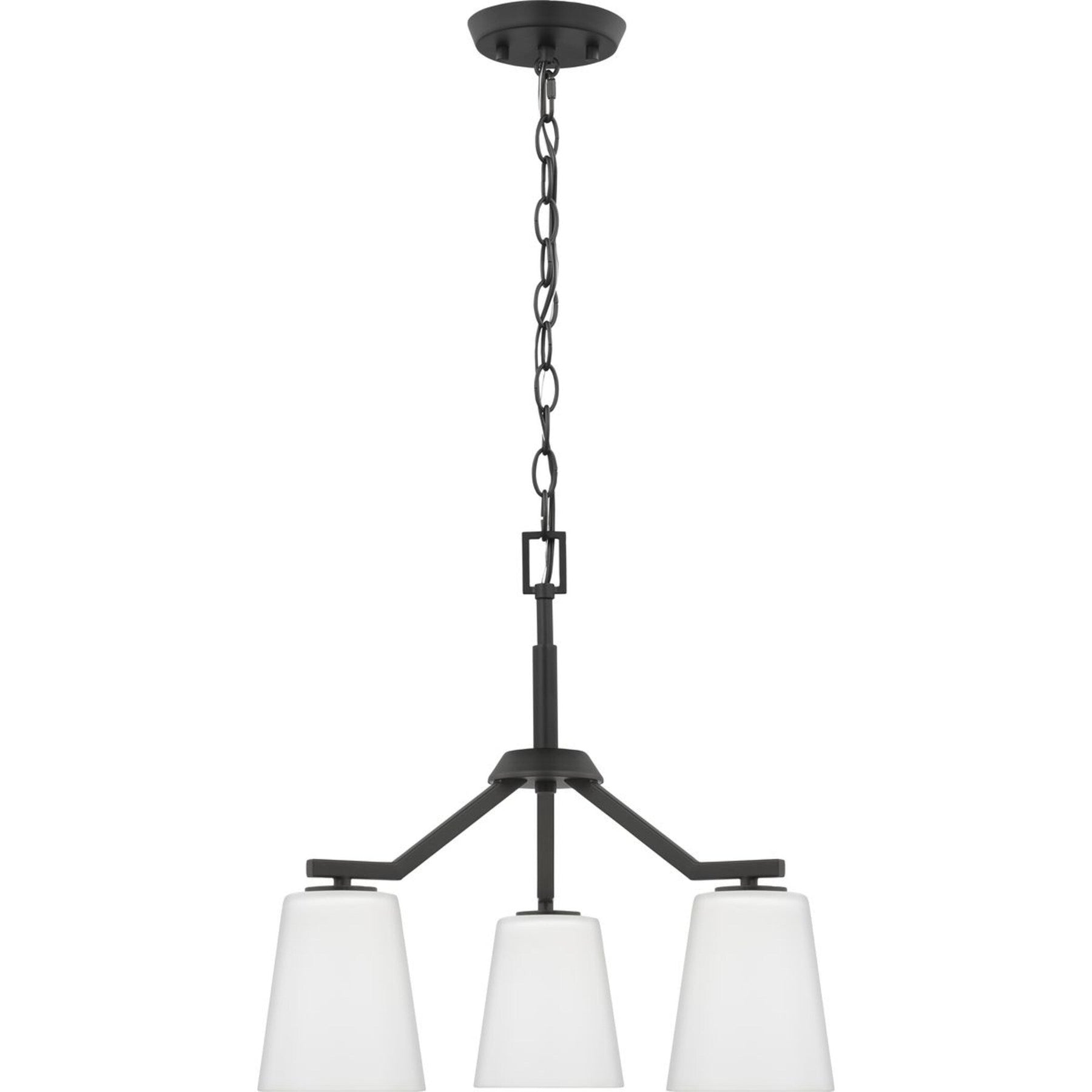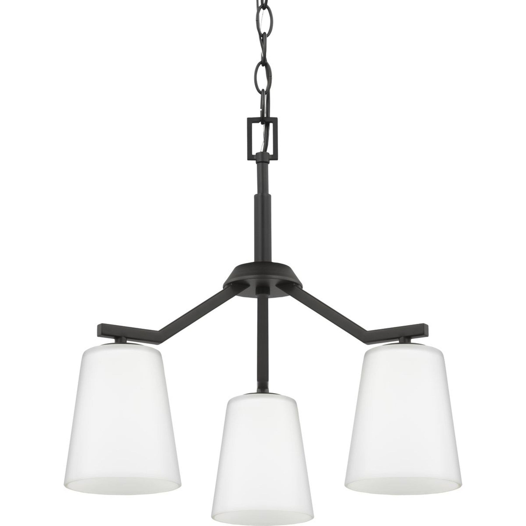 The Vertex 3-Light Matte Black Pendant Light by Progress Lighting delivers a stunning modern aesthetic with its distinctive angular frame and etched glass cone shades. Designed for versatility, it can transform your space whether installed as a chandelier or a semi-flush mount fixture.