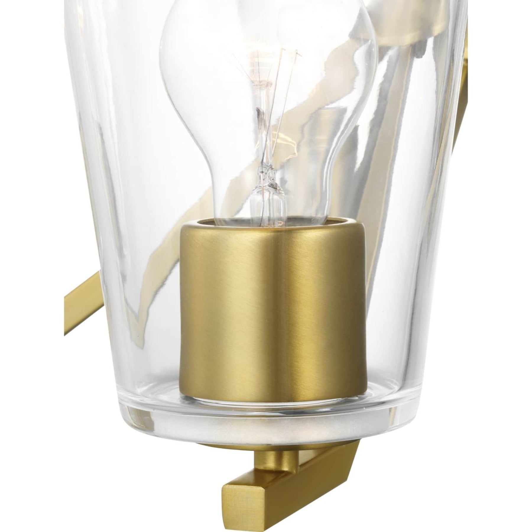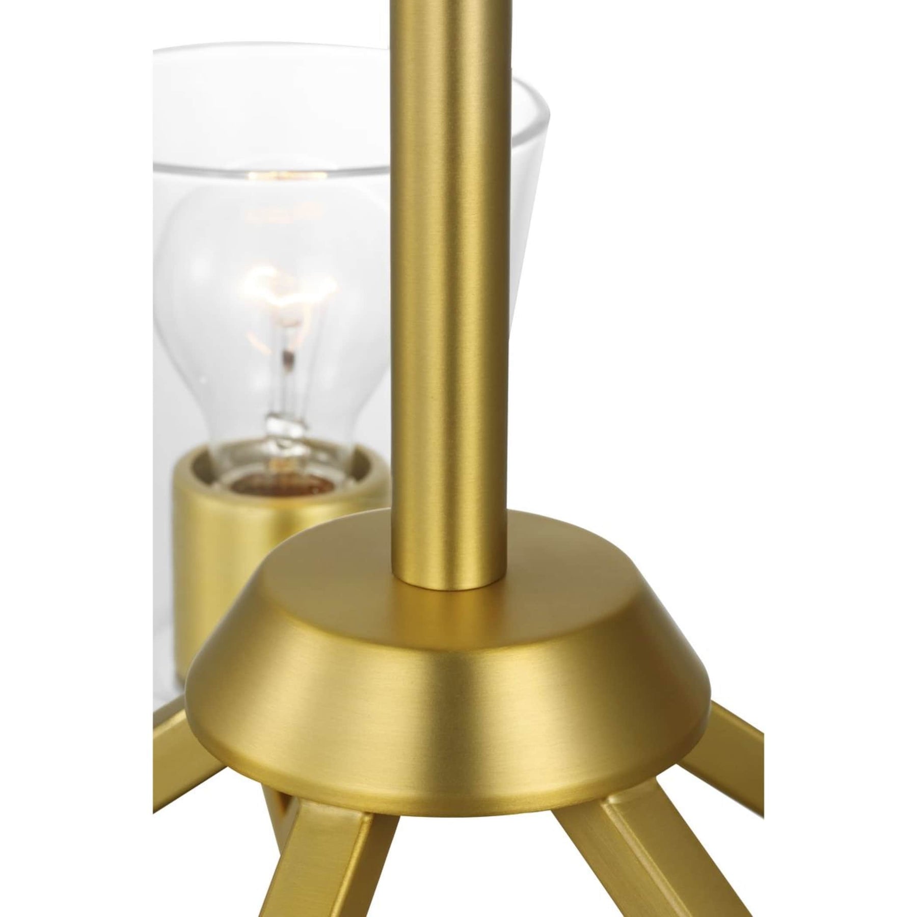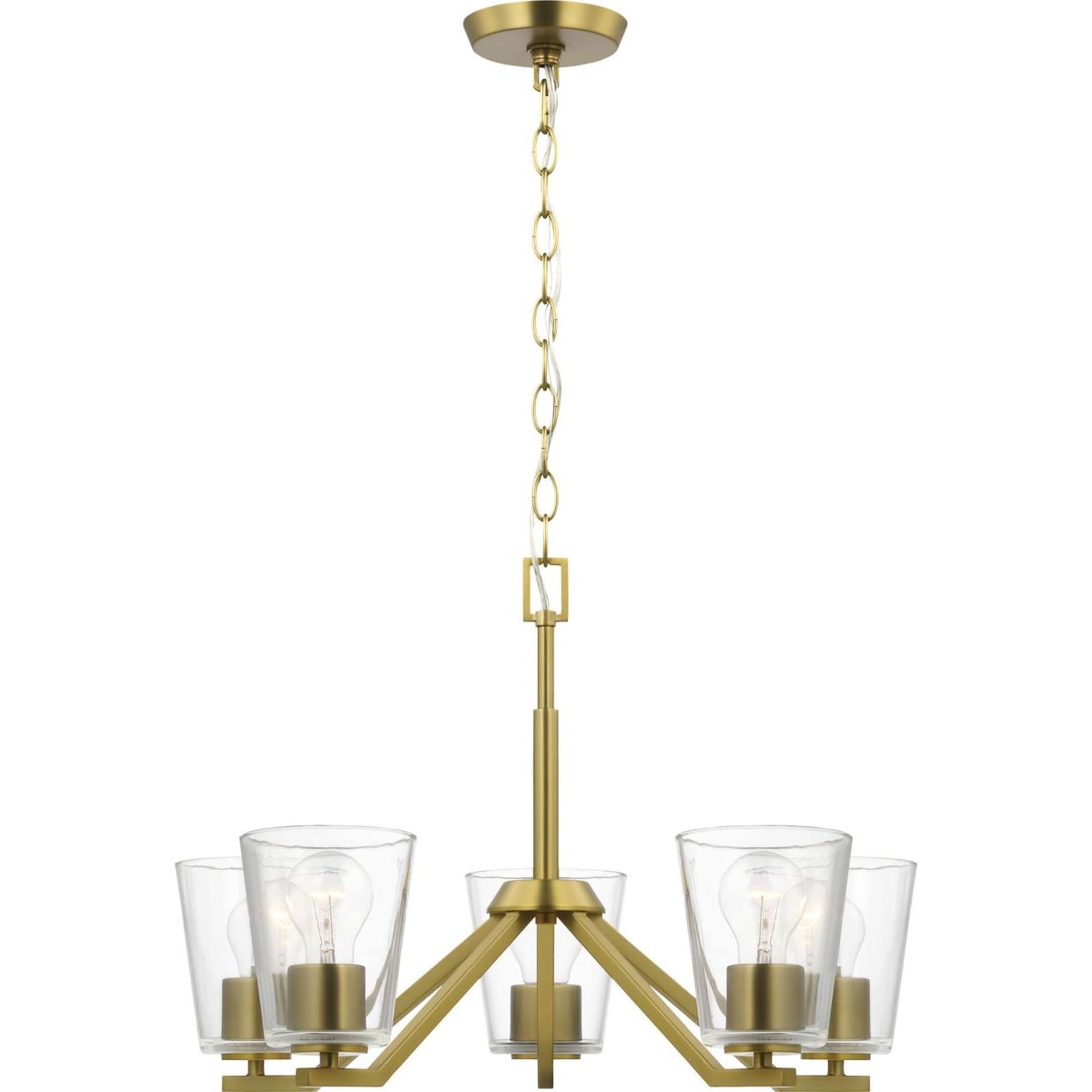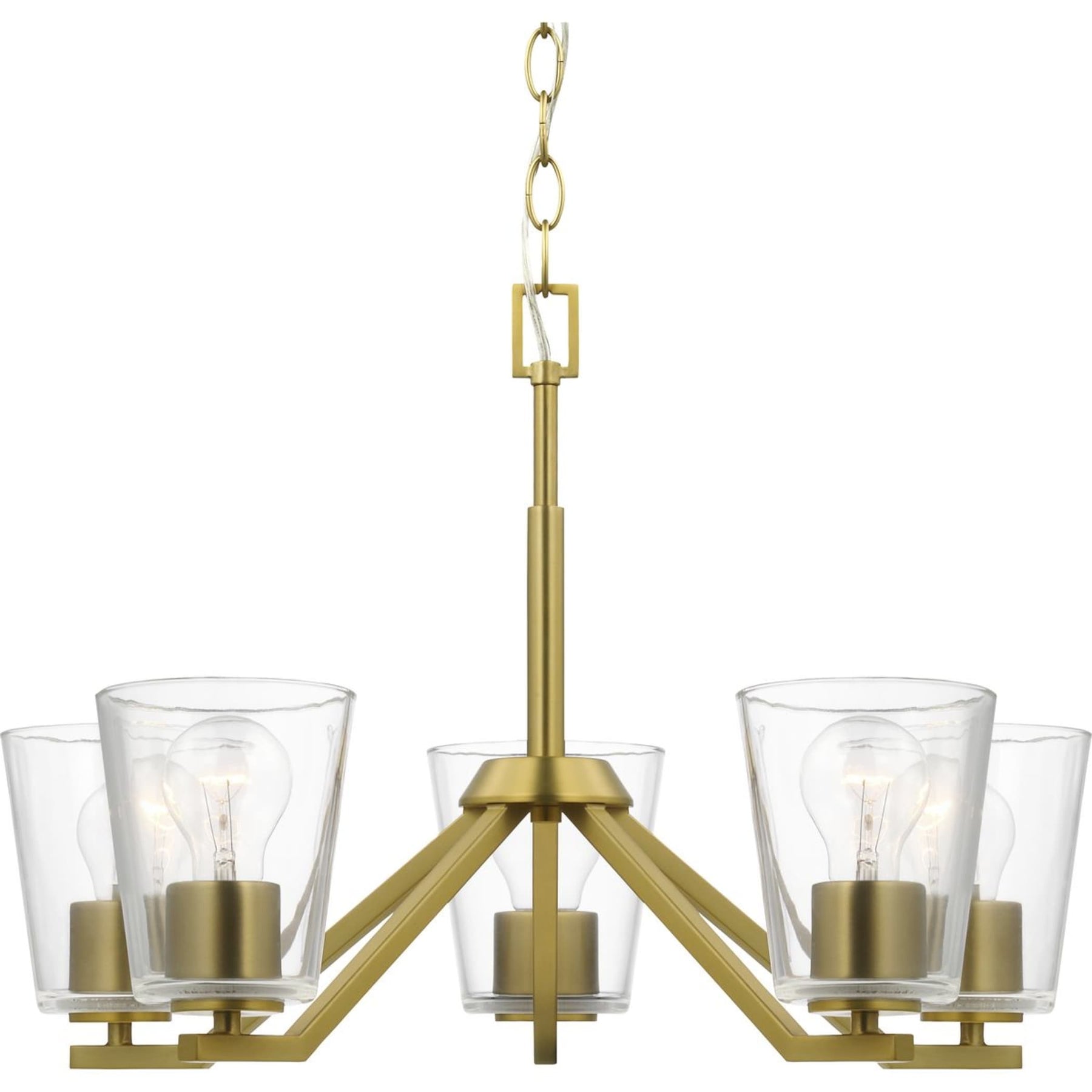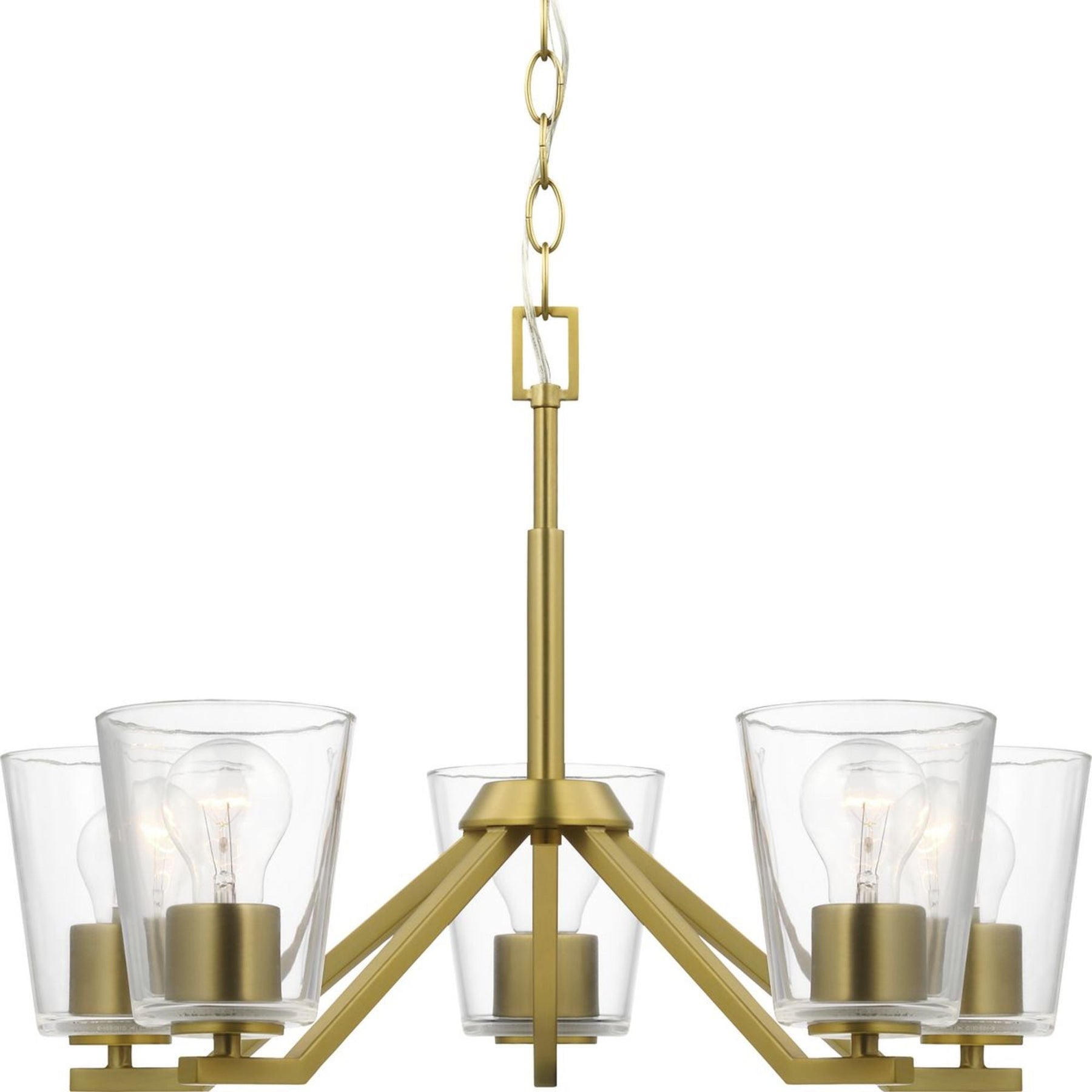 Illuminate your space with the Vertex 5-Light Brushed Gold Chandelier—a perfect blend of modern elegance and versatile functionality. This striking fixture enhances any room with its angular design and luxurious brushed gold finish, casting ambient light through five clear cone glass shades. Designed for varied interior settings, it offers adjustable hanging height options to suit your style.