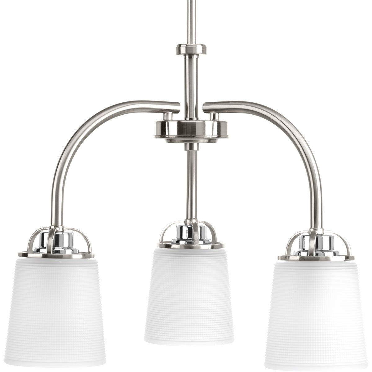 Illuminate your space with the West Village 3-Light Brushed Nickel Transitional Chandelier from Progress Lighting. This exquisite fixture blends industrial charm with modern elegance, offering a polished look for dining rooms, living areas, and more. Featuring etched double prismatic glass shades and a versatile brushed nickel finish, it transforms any room with its sophisticated illumination.