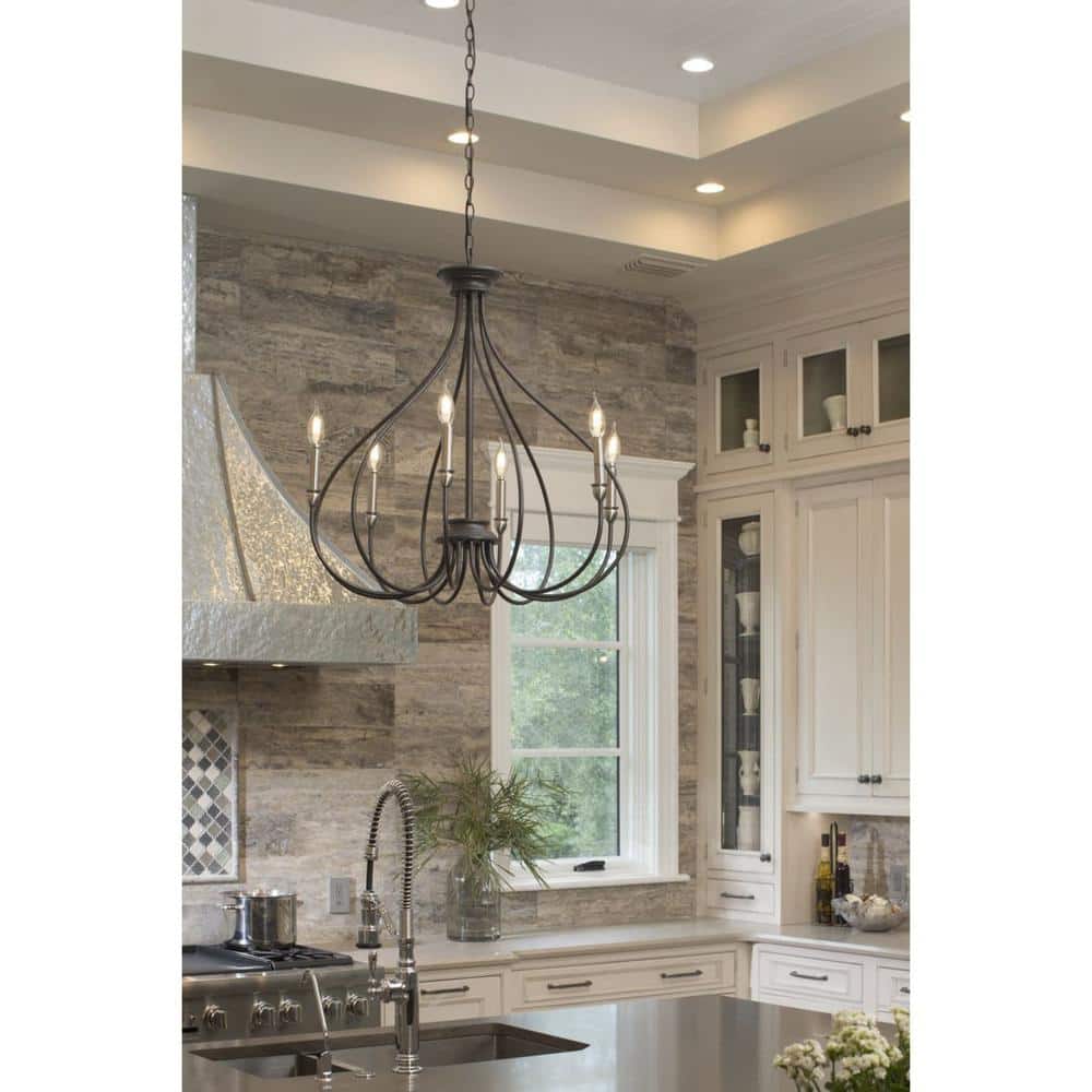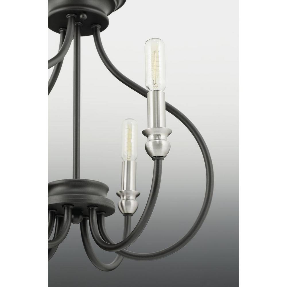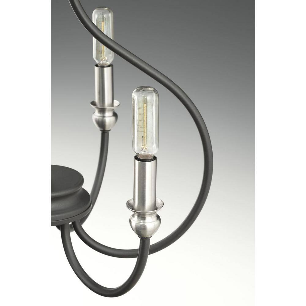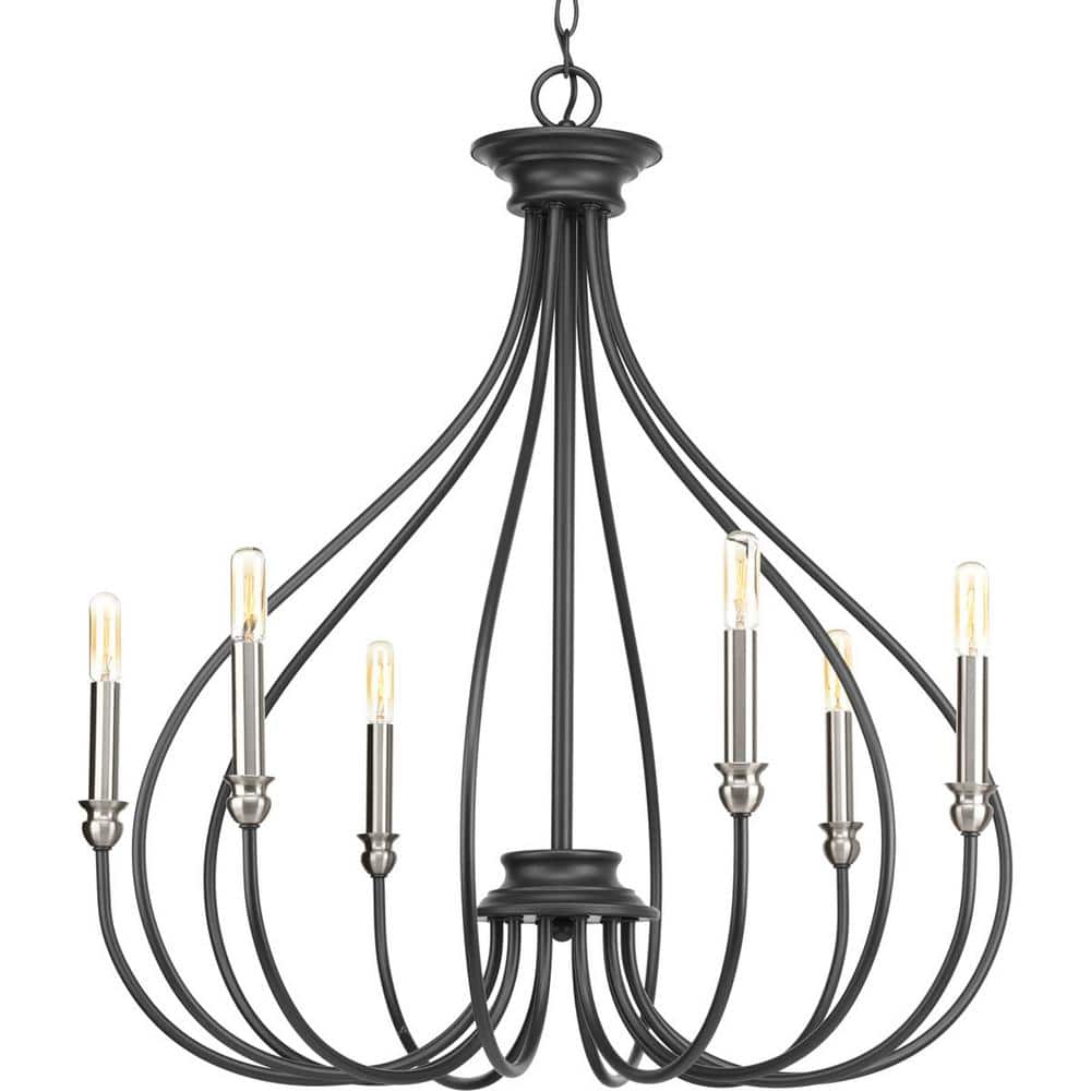 Elevate your interior design with the Whisp 6-Light Graphite Farmhouse Chandelier by Progress Lighting. Featuring a gracefully scrolled frame and striking graphite finish with brushed nickel accents, this chandelier brings a touch of rustic elegance to any space. Ideal for kitchens, dining rooms, or entryways, it adapts effortlessly to sloped ceilings and provides a warm, inviting glow with dimmable lighting options.