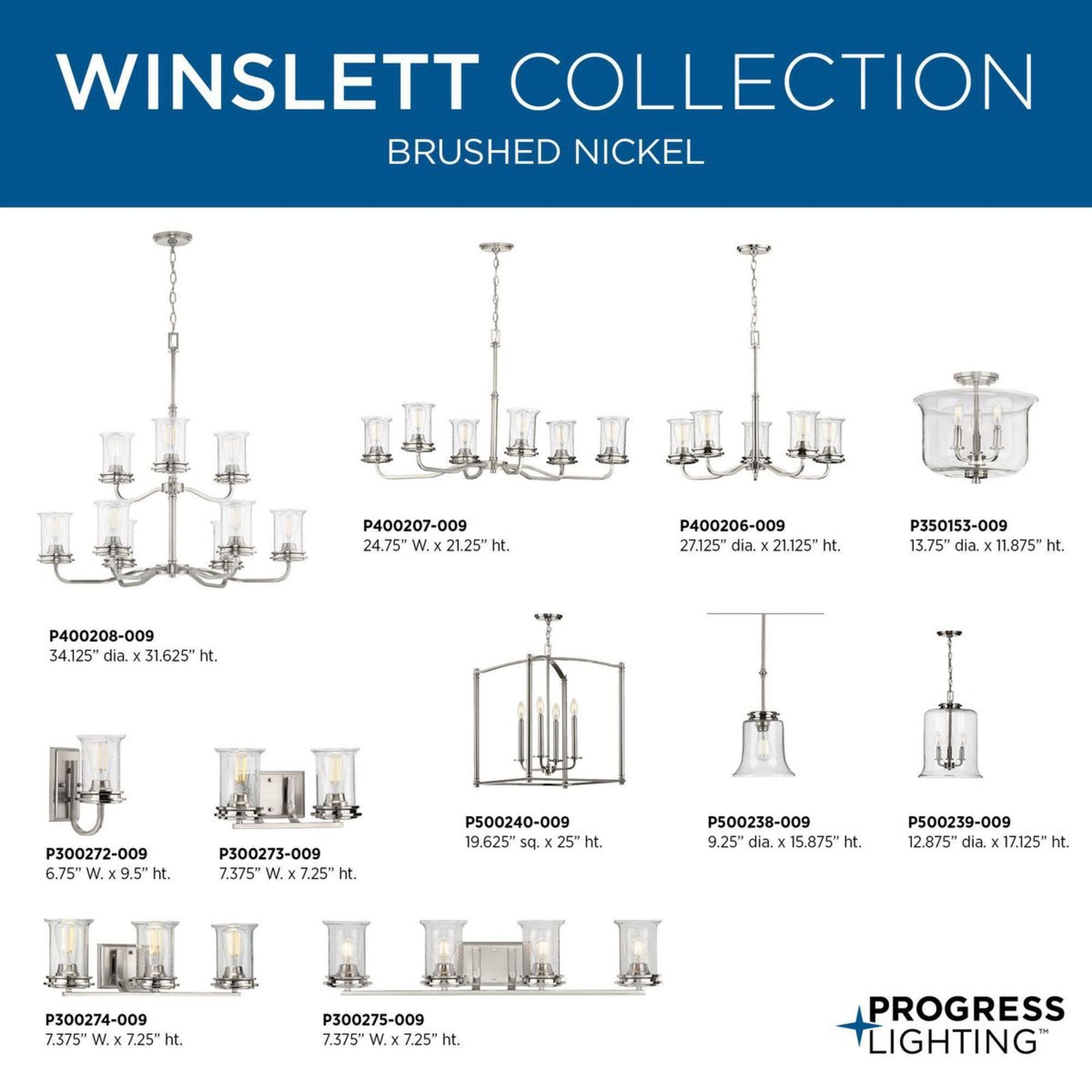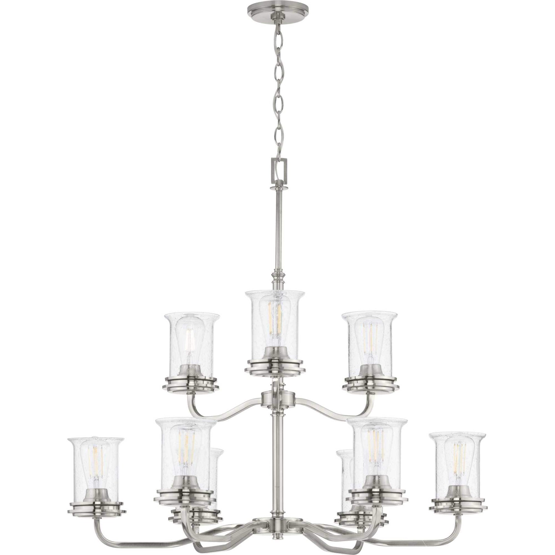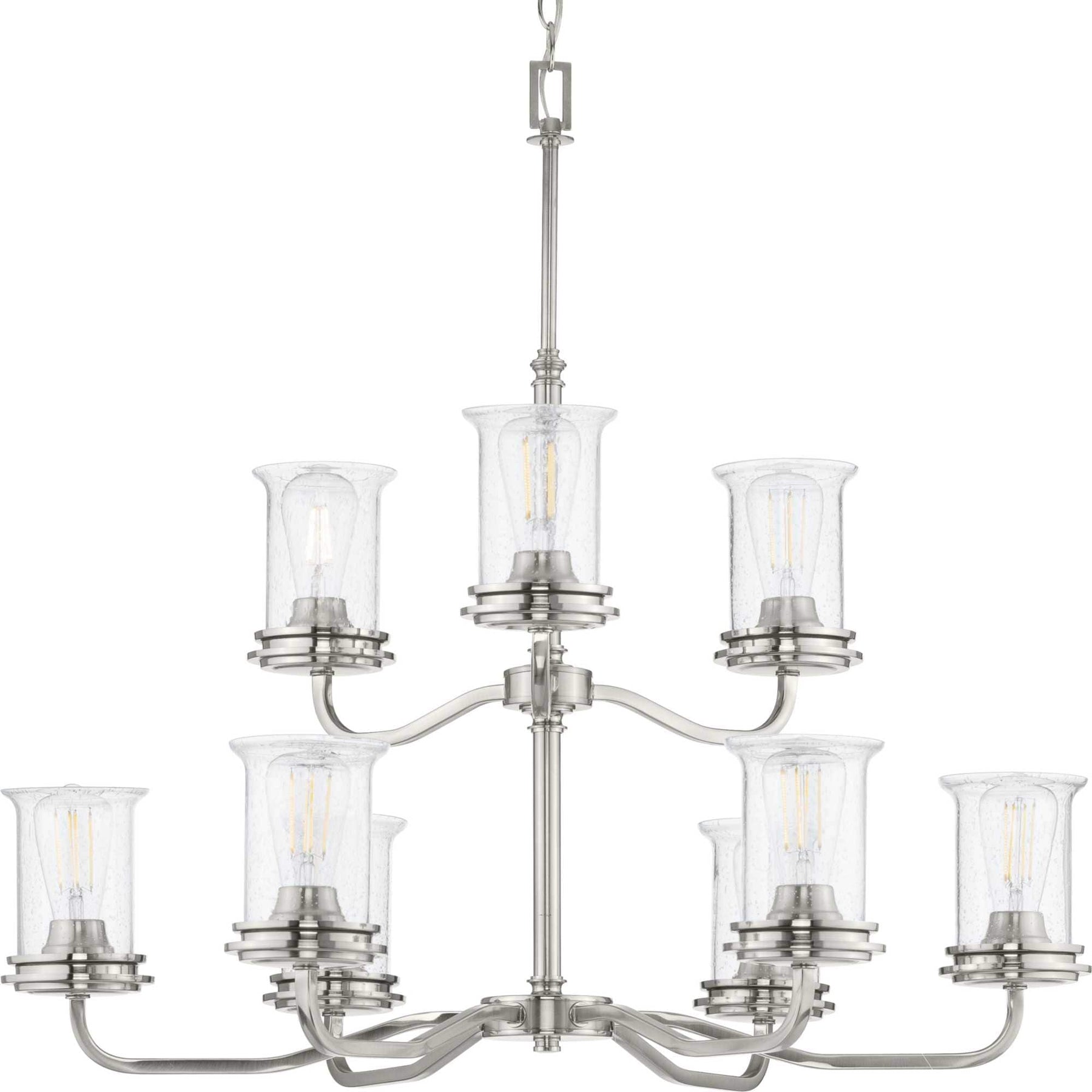 The Winslett 9-Light Chandelier by Progress Lighting effortlessly combines coastal charm with a touch of modern elegance. This striking fixture features a brushed nickel finish and rustic clear seeded glass shades, making it an ideal choice for various interior settings from dining rooms to foyers. With adjustable hanging heights, this chandelier offers versatility along with its captivating aesthetics.