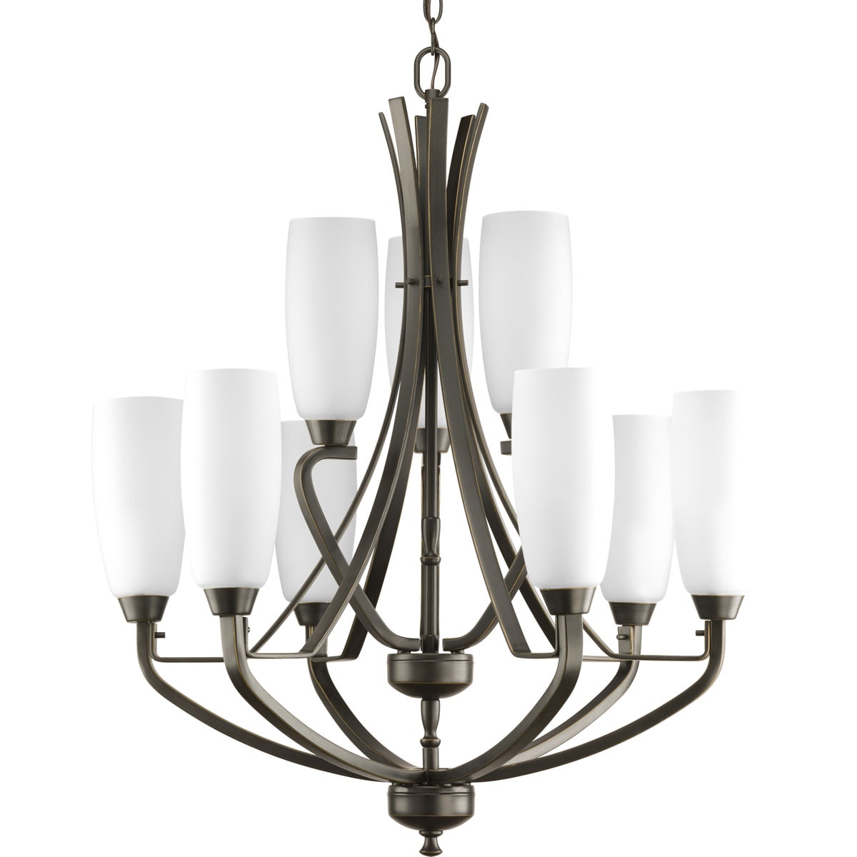Illuminate your space with style using the Wisten 9-Light Chandelier from Progress Lighting. This beautifully crafted fixture showcases a sophisticated antique bronze finish and elegant etched glass shades, perfect for enhancing both modern and transitional interiors. Enjoy ambient illumination with this two-tier design, while a versatile chain allows for customizable installation heights.