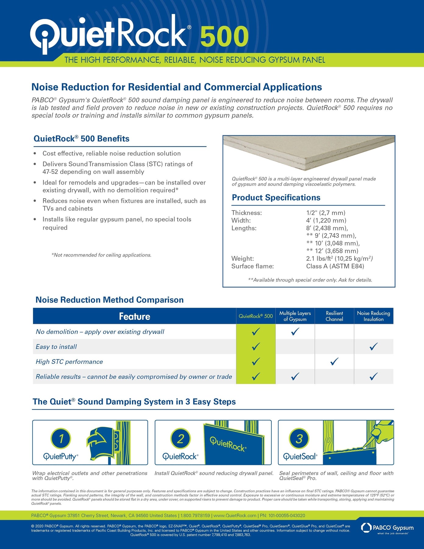 QuietRock 500 is your go-to solution for superior soundproofing in residential and commercial interiors. These innovative panels feature a multi-layer design with sound-absorbing polymers, offering professional-grade acoustic control while installing just like regular drywall.