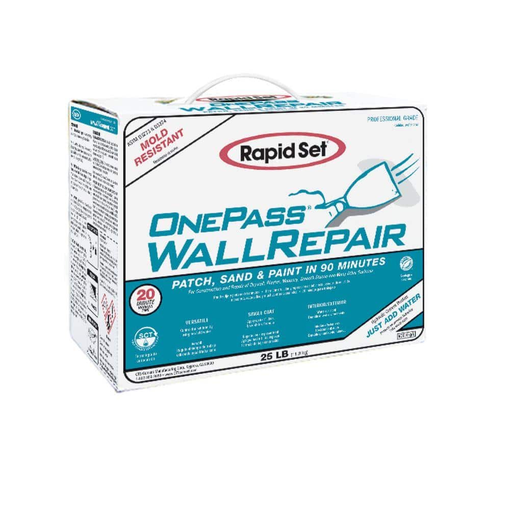 Rapid Set's 25 lbs. One Pass Wall Repair and Joint Compound is a versatile solution for construction and wall repair, designed for efficient single coat application. Made with premium-grade hydraulic cement, it sets rapidly and is perfect for both interior and exterior use, offering long-lasting durability in wet environments.