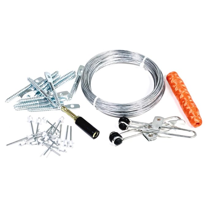 A: The kit includes a lag screw driver, eye lag screws, hanging wire, leveling clamps, and rivets.