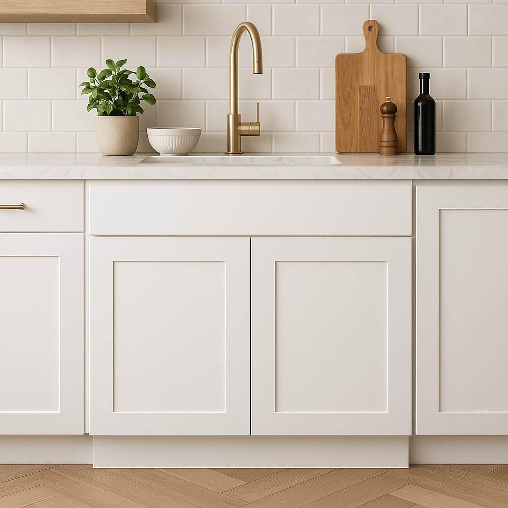 Transform your kitchen with the RELIABILT Fairplay 36-in White Shaker Sink Base Cabinet—easy to assemble, durable, and designed for lasting beauty.