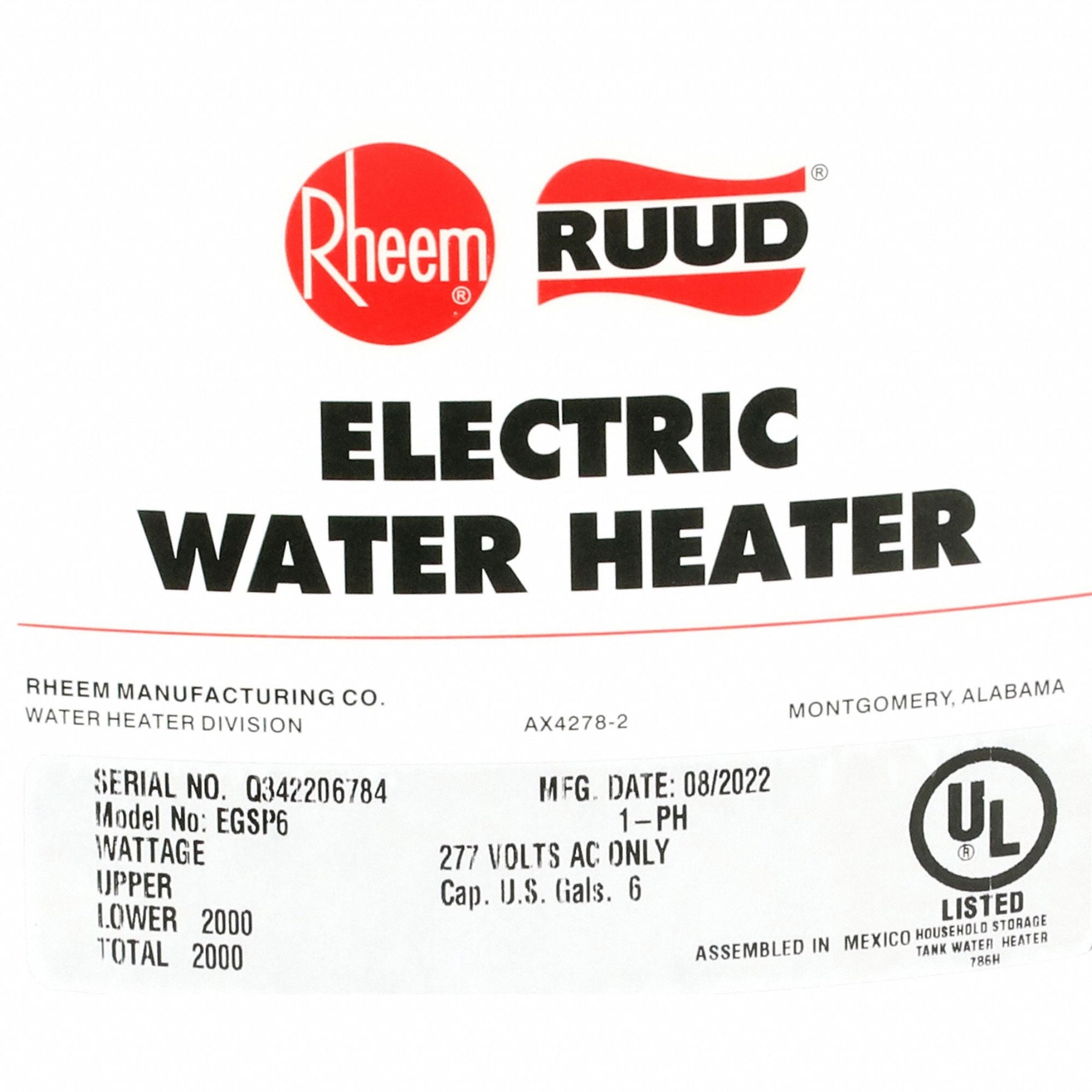 RHEEM 6-Gallon Electric Water Heater - 277V, 2,000W, Compact Design