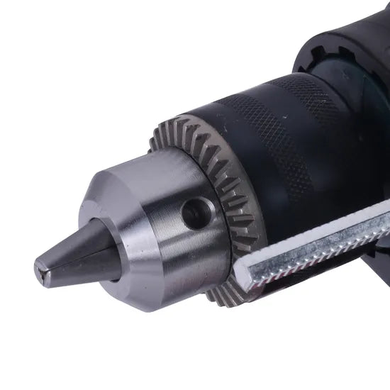 A: This model comes with a 13mm keyed chuck, ensuring a secure fit for drill bits.