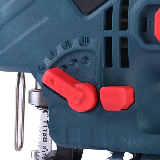 A: The jig saw features an easy-to-use speed control switch that lets you quickly adjust the speed to match your cutting task.