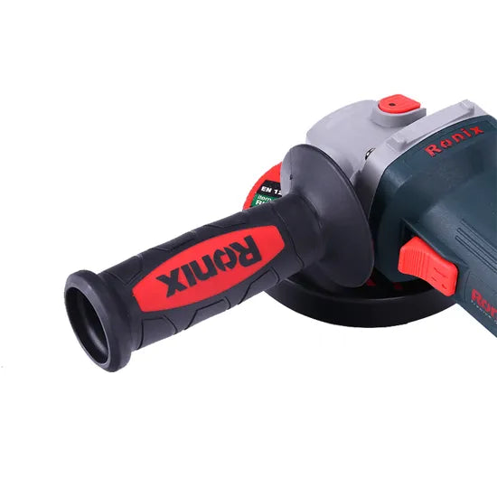 A: The grinder includes an ergonomic handle to enhance grip and prevent slips, as well as a robust guard to protect against debris.
