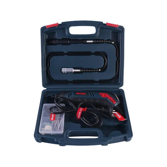 The Ronix Rotary 3403 is an industry-grade electric mini rotary tool kit, built for both robustness and precision across a myriad of applications. With a powerful 130W motor and variable-speed control ranging from 10,000 to 35,000 RPM, this tool kit is designed to tackle tasks from grinding to cutting with ease, all encased in a compact, lightweight design that ensures comfort and control during use.