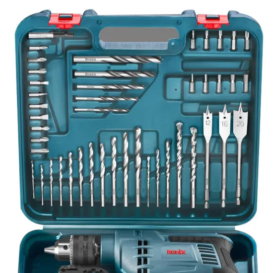 The Ronix 52 PCS Home Impact Drill Kit is the ultimate toolbox for your home improvement projects, crafted from PA6+GF30 materials for superior durability. With a powerful 1050W motor and a no-load speed of up to 2700 RPM, this impact drill tackles both building and industrial tasks efficiently. The set includes everything you need, neatly organized in a stylish blue toolbox.