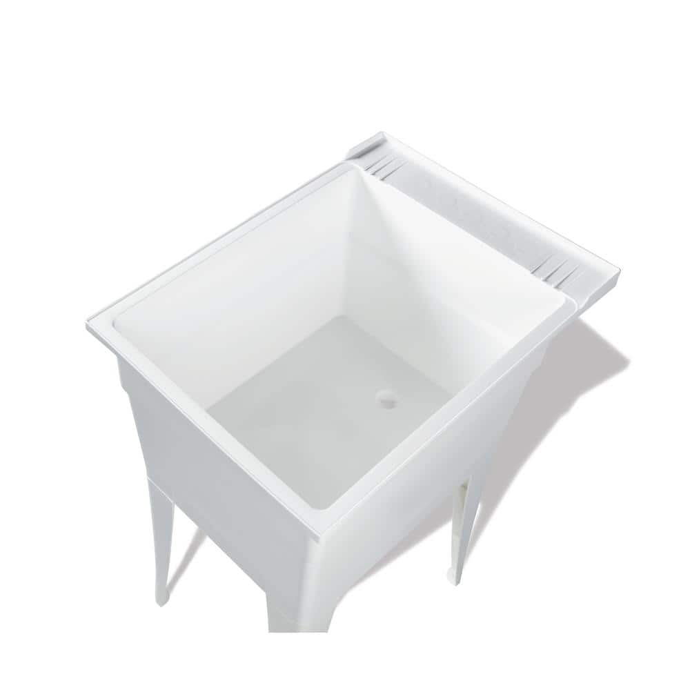 Upgrade your home or garage with the RUGGED TUB 18 x 24-inch Freestanding White Utility Laundry Sink. Designed for versatility, this heavy-duty sink features integrated soap dishes and non-rust adjustable feet. Perfect for tight spaces, it provides durability and flexibility for various settings.