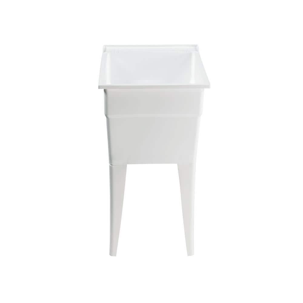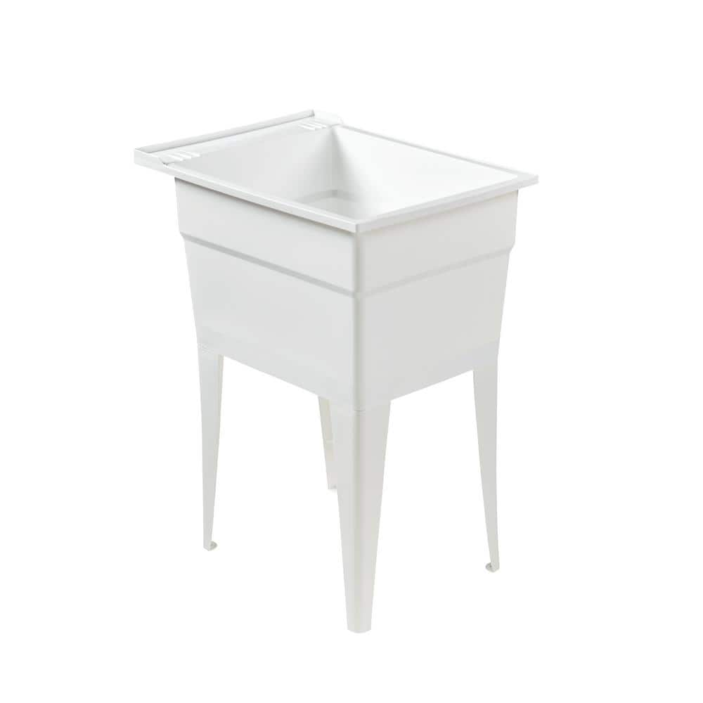 The RUGGED TUB 18 in x 24 in White Freestanding Utility Laundry Sink offers unparalleled durability with its heavy-duty polypropylene construction. Ideal for tight spaces, this versatile sink is perfect for laundry rooms, garages, and utility areas. It features non-rust adjustable legs and integrated soap dishes, making it a practical choice for any home improvement project.