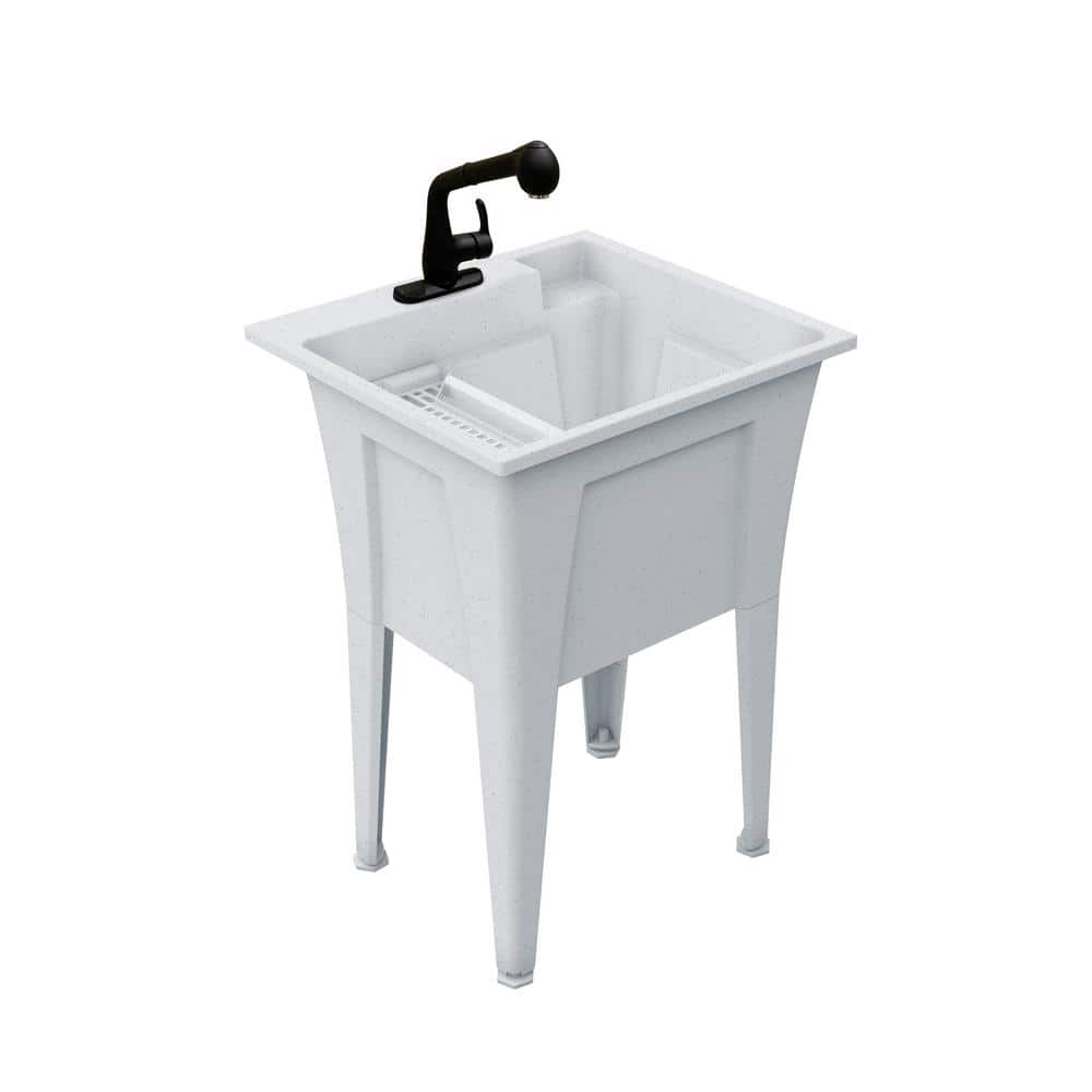 The RUGGED TUB utility sink infuses any space with a sophisticated granite texture that brings both form and function to your home. The sleek black pullout faucet adds a modern contrast, transforming mundane tasks into elegant rituals. Position this freestanding fixture in your laundry room or garage to create a stunning visual center while enjoying its practical utility. This essential piece is a hallmark of innovative design and luxury living, offering effortless style and functionality in one impactful package.
