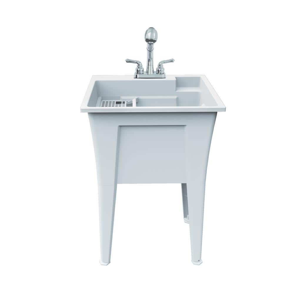 RUGGED TUB's Granite Freestanding Utility Sink combines functionality and durability, featuring a 24" x 22" heavy-duty polypropylene basin with a stylish speckled gray finish. Ideal for laundry or utility spaces, it includes a chrome pullout faucet and an installation kit for hassle-free setup. Rust-proof and easy to level, its adjustable feet ensure stability on any surface.