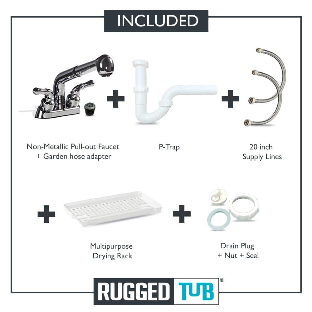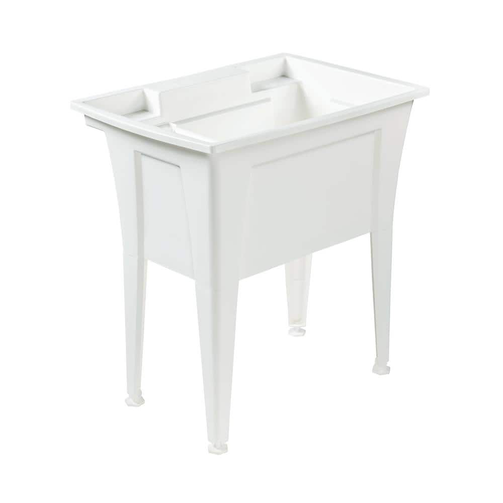 The RUGGED TUB 32" Freestanding Utility Sink is a versatile addition to any workspace, whether it be laundry, garage, or utility room. Featuring a durable construction with 100% virgin polypropylene, it includes a stylish black pullout faucet and a complete installation kit. Its robust design serves both form and function, ensuring long-lasting durability and ease of assembly.