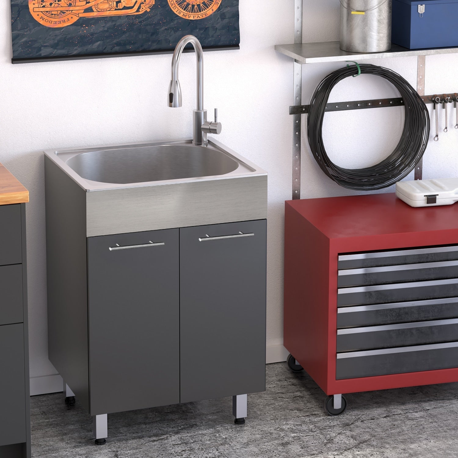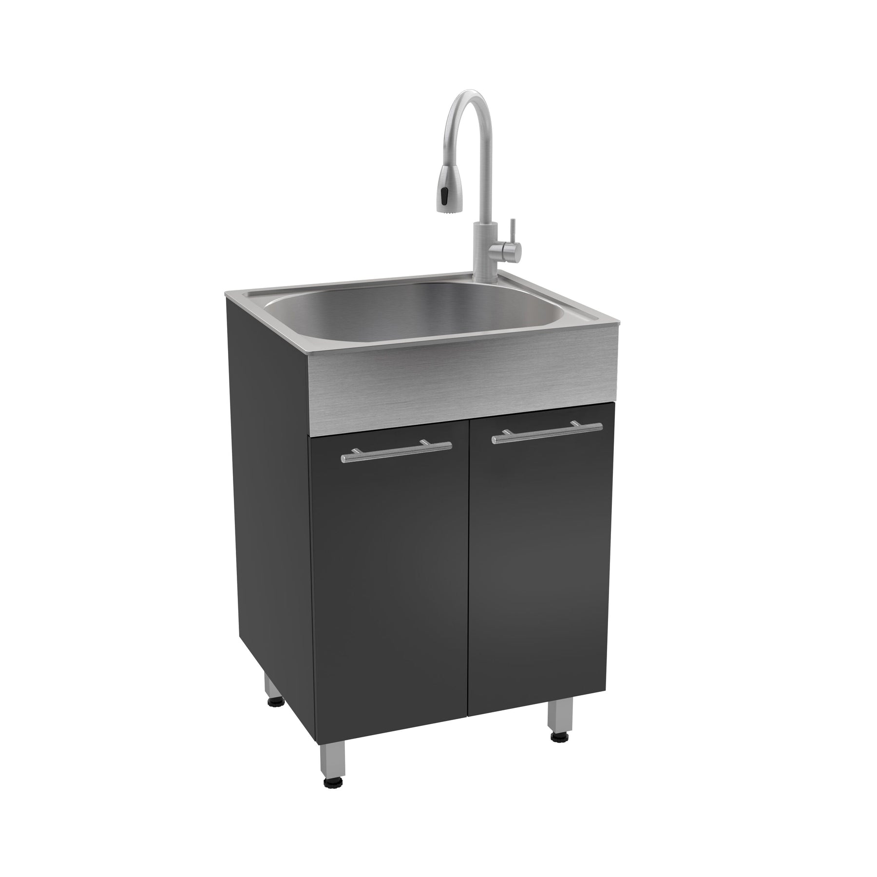 Upgrade your workspace with the RuggedTub Charcoal Freestanding Utility Tub. This all-in-one, 24-inch utility unit features a robust stainless steel sink with a pull down faucet, housed in a stylish charcoal cabinet with brushed aluminum accents. Designed for easy installation, it’s a durable and practical addition to any laundry room or mudroom.