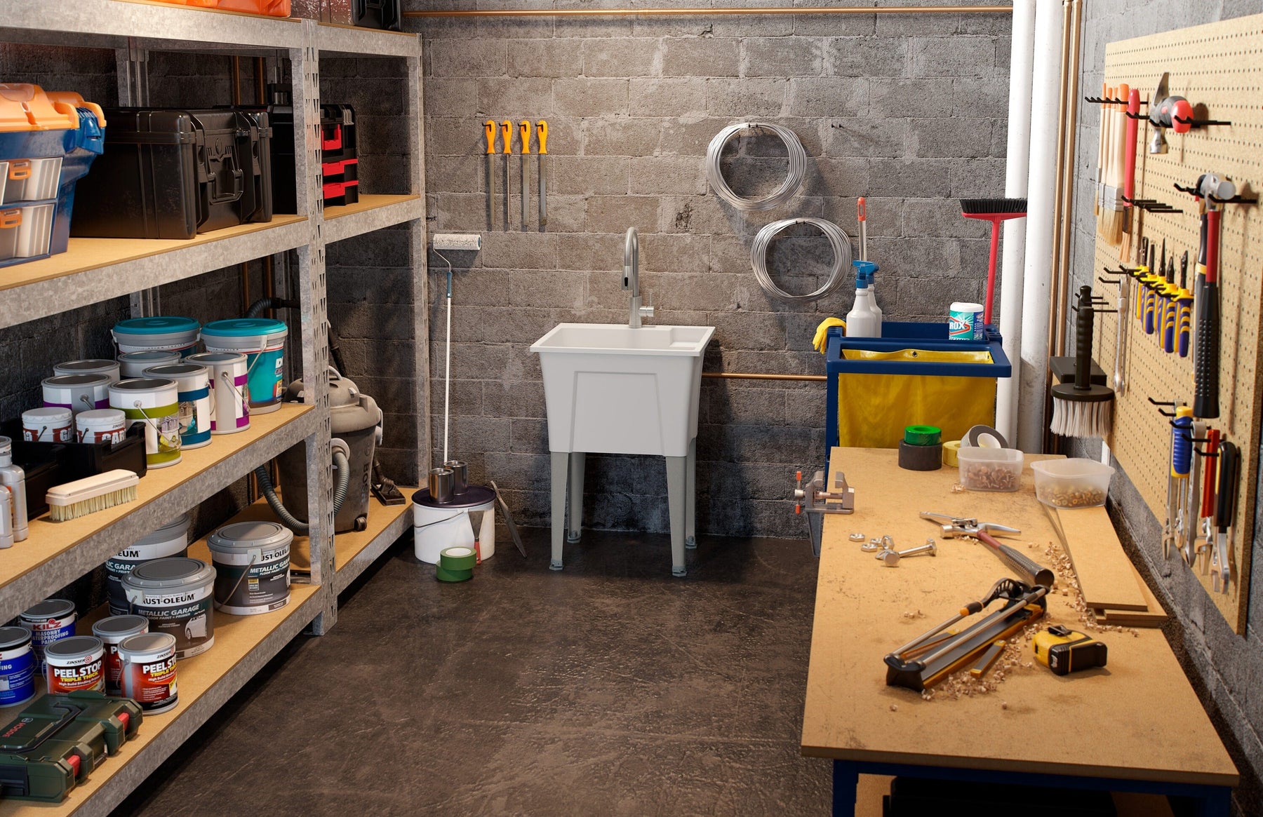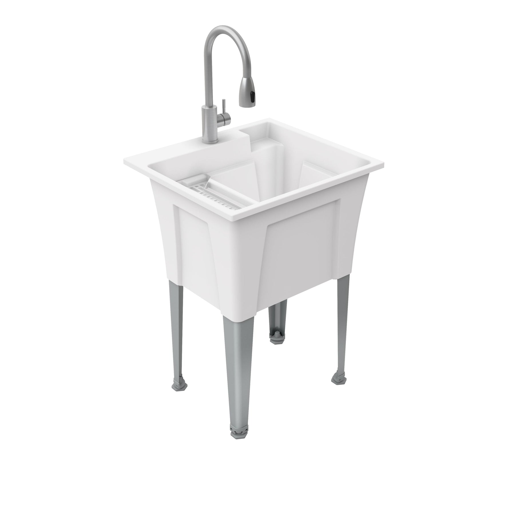 Discover the durable and hygienic RuggedTub Utility Tub, equipped with anti-microbial protection and a stainless steel faucet to tackle any home project. Designed with a freestanding structure and tough steel legs, this utility sink is perfect for laundry rooms, garages, and basements.