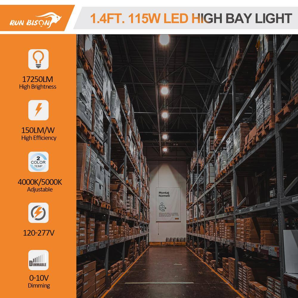 Illuminate large spaces with the RUN BISON 115-Watt LED Dimmable Linear High Bay Light, designed for superior lighting efficiency. With 17,000 lumens and dual-color temperature settings, this light fixture is perfect for commercial spaces like workshops, garages, and retail environments. Crafted from durable steel, this energy-saving fixture is FCC and UL certified, ensuring durability and long-lasting performance.
