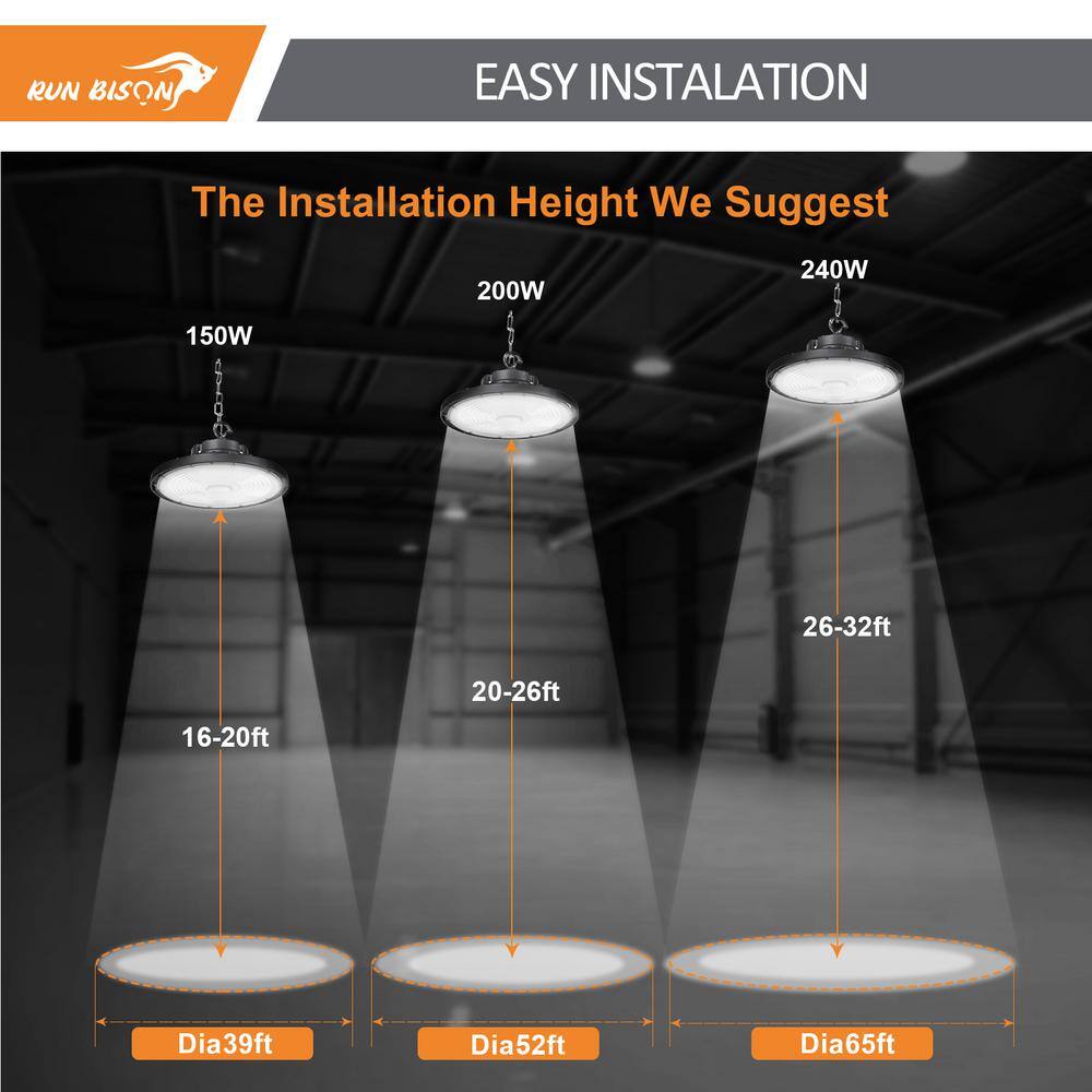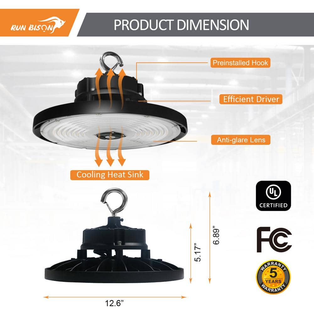 RUN BISON 12.6 in. 150/200/240-Watt Selectable Dimmable Integrated LED UFO High Bay Light with Preinstalled Hook, 3000/4000/5000K