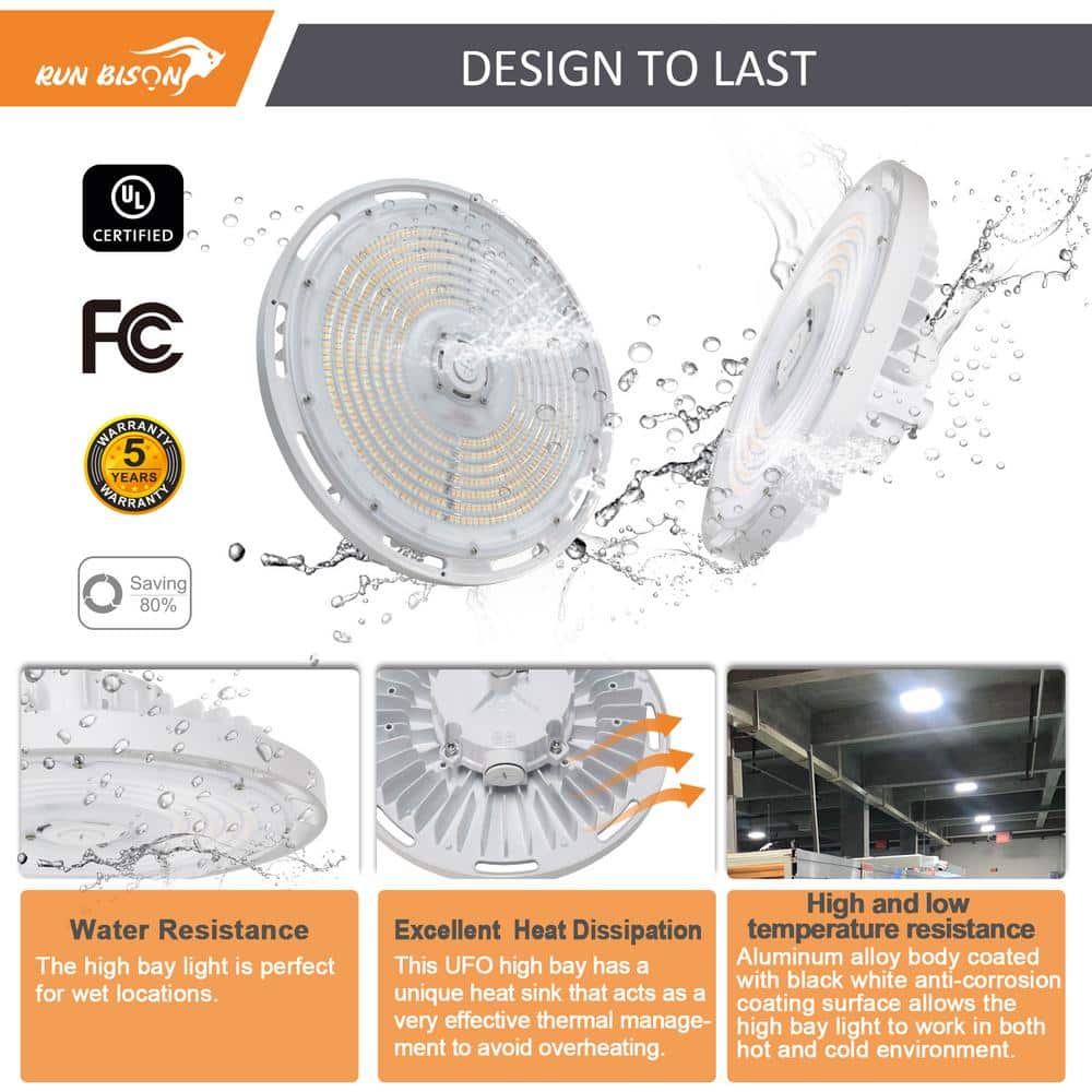 A: The RUN BISON UFO High Bay Light is ideal for warehouses, factories, gyms, and supermarkets. It can also handle environments with high humidity, high temperatures (up to 50°C), and salt fog.